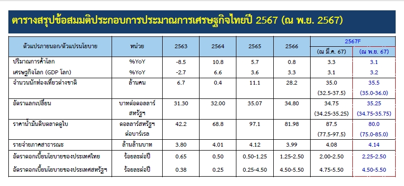 ศูนย์พยากรณ์เศรษฐกิจและธุรกิจ ม.หอการค้าไทย คงประมาณการจีดีพีของไทยปี 2567 ที่ 2.6% (คาดว่า GDP ในไตรมาสที่ 4/2567 จะเร่งตัวขึ้นเป็น 3.6%) ภาคบริการถือเป็นแรงขับเคลื่อนหลัก โดยขยายตัว 3.8% ในปี 2567 นำโดยการท่องเที่ยวที่คาดว่าจะมีนักท่องเที่ยวต่างชาติ 35-36 ล้านคน ขณะที่การบริโภคภาคเอกชนมีแนวโน้มขยายตัวแข็งแกร่งที่ 5.0% โดยมีแรงหนุนจากมาตรการแจกเงิน 10,000 บาท เฟส 1 (กลุ่มเปราะบาง) ด้านการส่งออกสินค้าคาดว่าจะขยายตัว 4.6% ในปี 2567 การลงทุนรวมขยายตัวเพียง 0.1% โดยการลงทุนภาคเอกชนหดตัว -0.4% แม้การลงทุนภาครัฐจะขยายตัว 2.0%