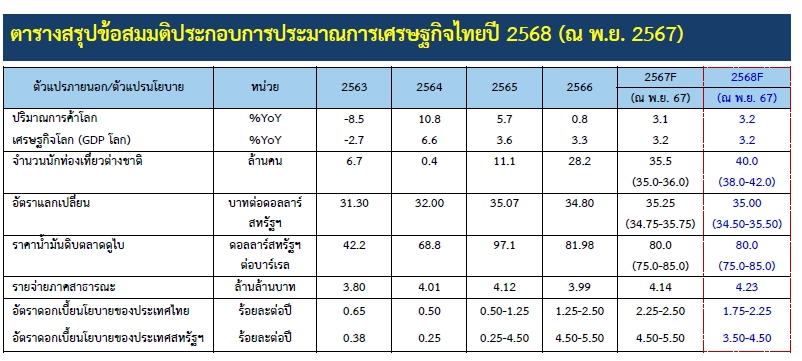 สำหรับในปี 2568 มองการเติบโตทางเศรษฐกิจมีแนวโน้มแข็งแกร่งขึ้น ประมาณการณ์ GDP เติบโต 3.0% โดยมีภาคบริการเป็นแรงขับเคลื่อนหลัก ขยายตัว 4.0% โดยเฉพาะการท่องเที่ยวที่คาดว่าจะมีนักท่องเที่ยวต่างชาติ 38-42 ล้านคน