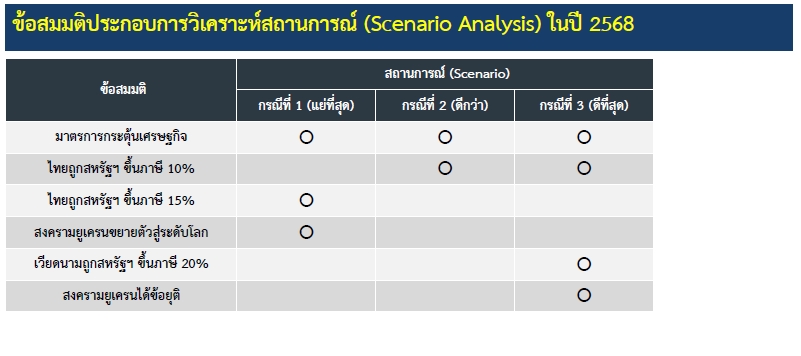 ทั้งนี้ มีปัจจัยเสี่ยงที่สำคัญ ได้แก่ ความเสี่ยงจากการที่ไทยถูกสหรัฐฯ ขึ้นภาษี 15% และสงครามยูเครนขยายตัวสู่ระดับโลก อาจส่งผลทาให้ GDP ปรับตัวลดลง -2.1% และทำให้อัตราเงินเฟ้อทั่วไปปรับตัวเพิ่มขึ้น 1.2% เมื่อเทียบกับกรณีฐาน, ความเสี่ยงจากการชะลอตัวของเศรษฐกิจจีนและสหรัฐฯ เนื่องจากการขึ้นภาษีนาเข้าและการตอบโต้ทางการค้า, หนี้สินภาคครัวเรือนยังอยู่ในระดับสูงที่ 84.2% ต่อ GDP ถึงแม้ว่าจะมีแนวโน้มลดลง ความท้าทายเชิงโครงสร้าง, GDP ไทยมีอัตราการเติบโตต่ากว่าประเทศหลักในอาเซียนอย่างชัดเจน คาดการณ์ว่าภายใน 15 ปี สิงคโปร์ เวียดนาม ฟิลิปปินส์ และมาเลเซีย จะมี GDP แซงหน้าไทย. -516-สำนักข่าวไทย