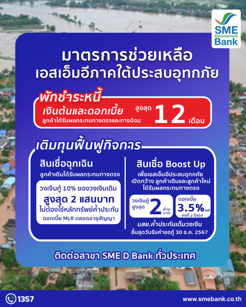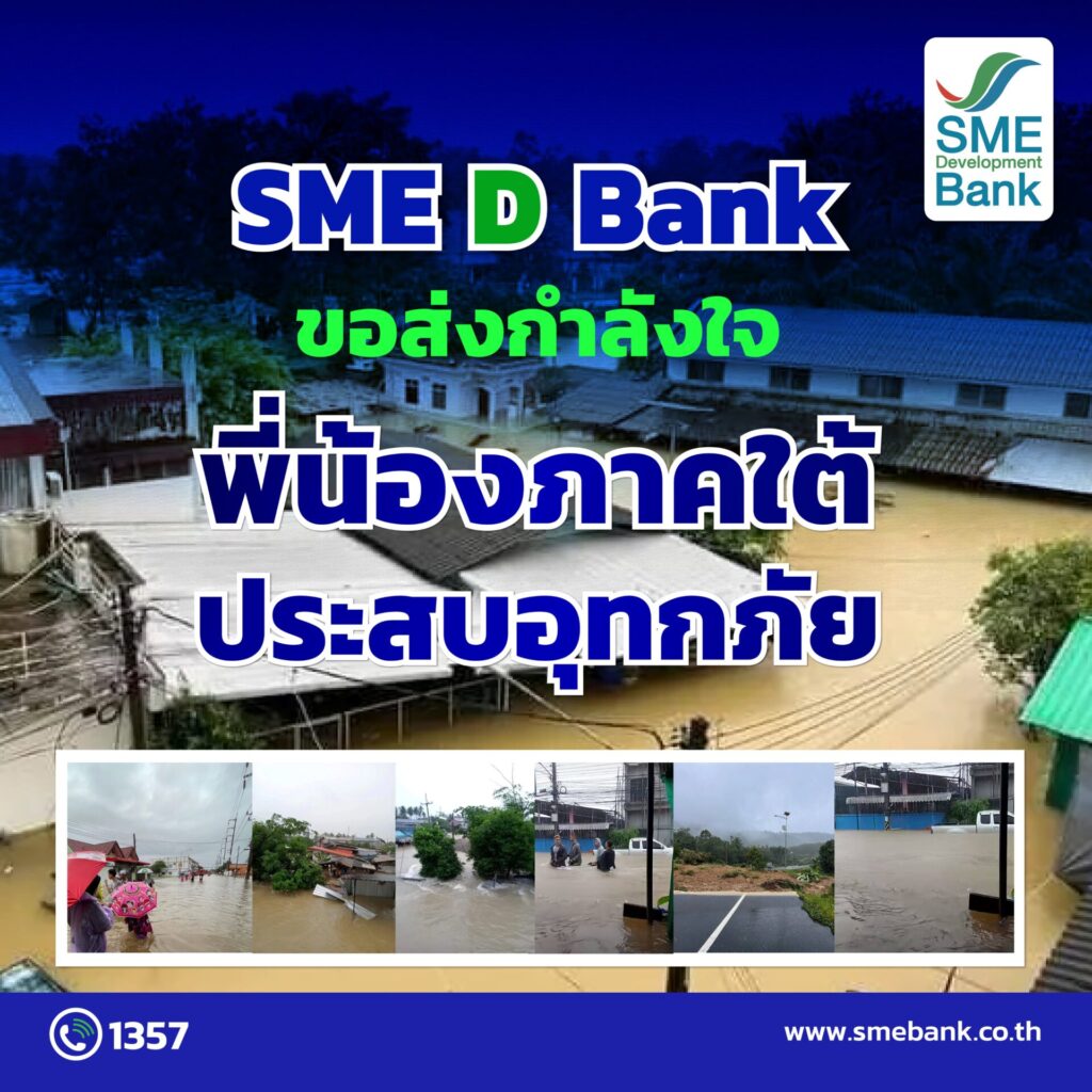 SME D Bank ออกมาตรการเร่งด่วนช่วยเหลือเอสเอ็มอีภาคใต้ได้รับผลกระทบจากสถานการณ์ภัยพิบัติและสาธารณภัย ได้แก่ “พักชำระหนี้เงินต้นและดอกเบี้ย” ลูกค้าได้รับผลกระทบทางตรงและทางอ้อม สูงสุด 12 เดือน และ “เติมทุนฟื้นฟูกิจการ” พาก้าวข้ามวิกฤต