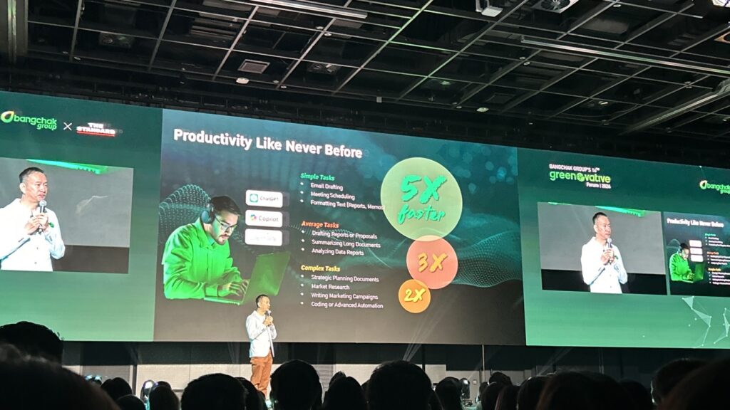 สำหรับงาน Greenovative Forum ครั้งที่ 14 “Crafting Tomorrow’s Future with Sustainable Energy and AI” จัดขึ้นในวาระครบรอบ 40 ปีบางจากฯ ก้าวสู่ทศวรรษที่ 5 ซึ่งได้ร่วมกับสำนักข่าว The Standard ณ ทรู ดิจิทัล พาร์ค เวสต์ โดยมีผู้เชี่ยวชาญจากหลากหลายวงการทั้งในและต่างประเทศมาร่วมแลกเปลี่ยนมุมมองและความรู้เกี่ยวกับบทบาทสำคัญของปัญญาประดิษฐ์ (AI) ในการสร้างอนาคตที่เป็นมิตรกับการจัดการด้านพลังงาน สังคม และสิ่งแวดล้อมอย่างสมดุลและยั่งยืน
