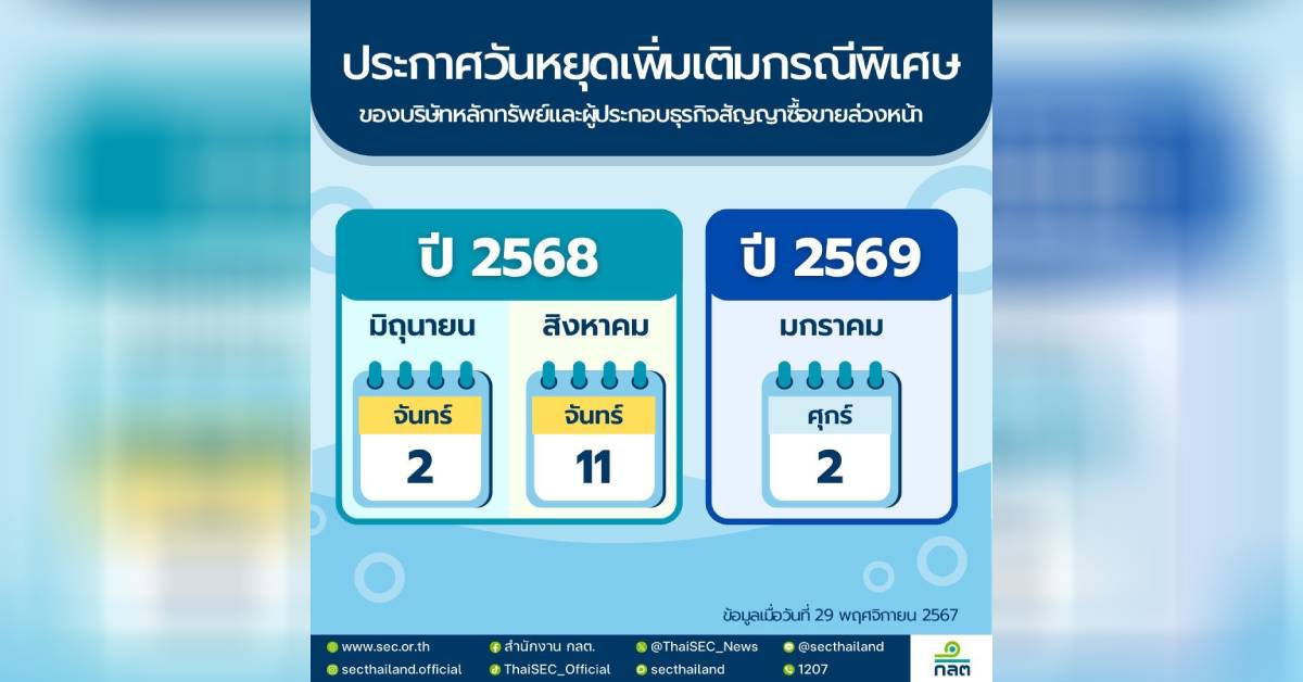 สำนักงานคณะกรรมการกำกับหลักทรัพย์และตลาดหลักทรัพย์ (ก.ล.ต.) พิจารณาแล้ว จึงกำหนดให้วันที่ 2 มิถุนายน 2568 และวันที่ 11 สิงหาคม 2568 รวมทั้งวันที่ 2 มกราคม 2569 เป็นวันหยุดทำการของบริษัทหลักทรัพย์และผู้ประกอบธุรกิจสัญญาซื้อขายล่วงหน้าเพิ่มเติมเป็นกรณีพิเศษตามมติคณะรัฐมนตรี เพื่อสนับสนุนนโยบายของรัฐบาลข้างต้น ซึ่งสอดคล้องกับวันหยุดทำการของสถาบันการเงินและสถาบันการเงินเฉพาะกิจ.-516.-สำนักข่าวไทย