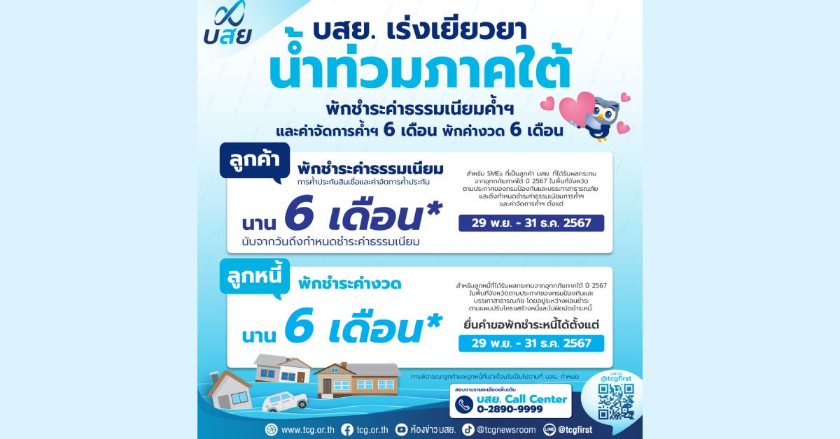 1.มาตรการช่วยลูกค้า บสย. พักชำระค่าธรรมเนียมและค่าจัดการค้ำประกัน 6 เดือน สำหรับ SMEs ลูกค้า บสย. ที่ได้รับผลกระทบจากอุทกภัยภาคใต้ปี 2567 และถึงกำหนดชำระค่าธรรมเนียมค้ำประกันและค่าจัดการค้ำประกัน ตั้งแต่วันที่ 29 พฤศจิกายน – 31 ธันวาคม 2567 โดยลูกค้าที่มีสิทธิเข้ามาตรการนี้มีจำนวนรวม 3,385 ราย คิดเป็นภาระค้ำประกันรวม 2,071 ล้านบาท