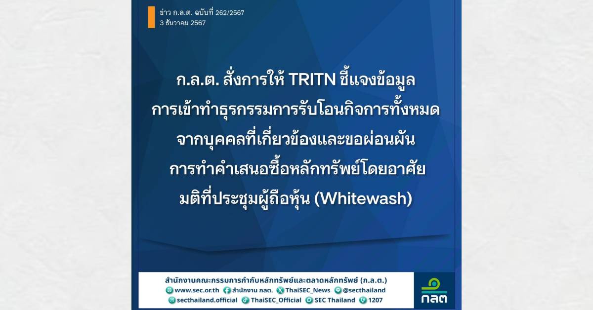 สำนักงานคณะกรรมการกำกับหลักทรัพย์และตลาดหลักทรัพย์ (ก.ล.ต.) สั่งการให้บริษัท ไทรทัน โฮลดิ้ง จํากัด (มหาชน) (TRITN) ชี้แจงข้อมูลภายในวันที่ 11 ธ.ค.นี้ กรณีคณะกรรมการบริษัทมีมติอนุมัติให้นำเสนอวาระเกี่ยวกับการได้มาซึ่งสินทรัพย์โดยการรับโอนกิจการทั้งหมดและออกหุ้นสามัญเพิ่มทุนให้แก่บุคคลในวงจำกัดกรณีที่มีนัยสำคัญซึ่งเข้าข่ายเป็นรายการเกี่ยวโยง การเพิ่มทุน การขอผ่อนผันการทำคำเสนอซื้อหลักทรัพย์ทั้งหมดของกิจการ (Whitewash) ต่อที่ประชุมวิสามัญผู้ถือหุ้น โดยคาดว่าจะจัดประชุมวันที่ 9 มกราคม 2568