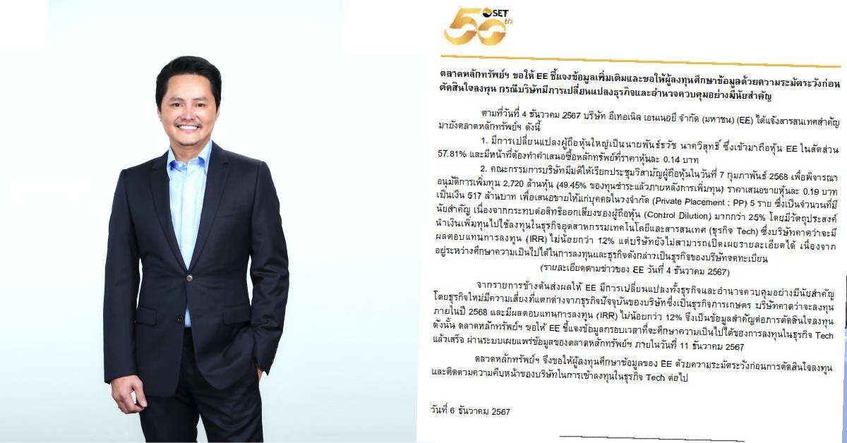 จากรายการข้างต้นส่งผลให้ EE มีการเปลี่ยนแปลงทั้งธุรกิจและอำนาจควบคุมอย่างมีนัยสำคัญ โดยธุรกิจใหม่มีความเสี่ยงที่แตกต่างจากธุรกิจปัจจุบันของบริษัทซึ่งเป็นธุรกิจการเกษตร บริษัทคาดว่าจะลงทุนภายในปี 2568 และมีผลตอบแทนการลงทุน (IRR) ไม่น้อยกว่า 12% จึงเป็นข้อมูลสำคัญต่อการตัดสินใจลงทุนนั้น ตลาดหลักทรัพย์ฯ ขอให้ EE ชี้แจงข้อมูลกรอบเวลาที่จะศึกษาความเป็นไปได้ของการลงทุนในธุรกิจ Tech แล้วเสร็จ ผ่านระบบเผยแพร่ข้อมูลของตลาดหลักทรัพย์ฯ ภายในวันที่ 11 ธันวาคม 2567