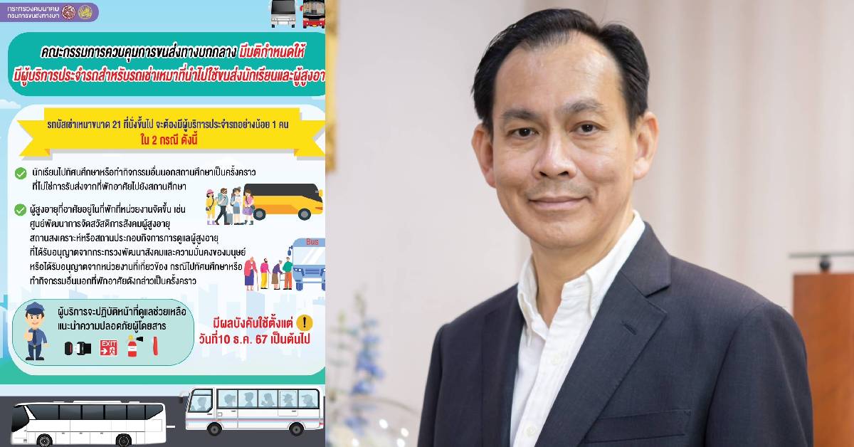 โดยกรมการขนส่งทางบกได้นำเรื่องนี้เสนอคณะกรรมการควบคุมการขนส่งทางบกกลางกำหนดให้มีผู้ประจำรถสำหรับรถโดยสารไม่ประจำทางที่มีจำนวนที่นั่งตั้งแต่ 21 ที่นั่งขึ้นไป ที่นำไปให้บริการนักเรียนและผู้สูงอายุโดยคณะกรรมการควบคุมการขนส่งทางบกกลาง ในการประชุมครั้งที่ 5/2567 เมื่อวันที่ 11 พฤศจิกายน 2567ได้มีมติอนุมัติให้ปรับปรุงหลักเกณฑ์การกำหนดเงื่อนไขเกี่ยวกับจำนวนผู้ประจำรถสำหรับการขนส่งไม่ประจำทางด้วยรถที่ใช้ในการขนส่งผู้โดยสาร เพื่อให้มีความปลอดภัยมากยิ่งขึ้น และออกประกาศฯ เรื่อง กำหนดและปรับปรุงเงื่อนไขในใบอนุญาตประกอบขนส่งไม่ประจำทางด้วยรถที่ใช้ในการขนส่งผู้โดยสาร ตามมาตรา 32 แห่งพระราชบัญญัติการขนส่งทางบก พ.ศ.2522 เพื่อกำหนดให้ผู้ประกอบการขนส่งไม่ประจำทางด้วยรถโดยสารต้องจัดให้มีผู้ประจำรถ ได้แก่ ผู้บริการ อย่างน้อย 1 คน สำหรับรถโดยสารไม่ประจำทางที่มีจำนวนที่นั่งตั้งแต่ 21 ที่นั่งขึ้นไป ในกรณีให้บริการรถโดยสารไม่ประจำทางสำหรับนักเรียนไปทัศนศึกษาหรือทำกิจกรรมอื่นนอกสถานศึกษาเป็นครั้งคราว ที่ไม่ใช่การรับส่งจากที่พักอาศัยไปยังสถานศึกษา รวมถึงการให้บริการรถโดยสารไม่ประจำทางสำหรับผู้สูงอายุที่อาศัยอยู่ในที่พักที่หน่วยงานจัดขึ้น เช่น ศูนย์พัฒนาการจัดสวัสดิการสังคมผู้สูงอายุ สถานสงเคราะห์หรือสถานประกอบกิจการการดูแลผู้สูงอายุที่ได้รับอนุญาตจากกระทรวงพัฒนาสังคมและความมั่นคงของมนุษย์ หรือได้รับอนุญาตจากหน่วยงานที่เกี่ยวข้อง กรณีไปทัศนศึกษาหรือทำกิจกรรมอื่นนอกที่พักอาศัยดังกล่าวเป็นครั้งคราว