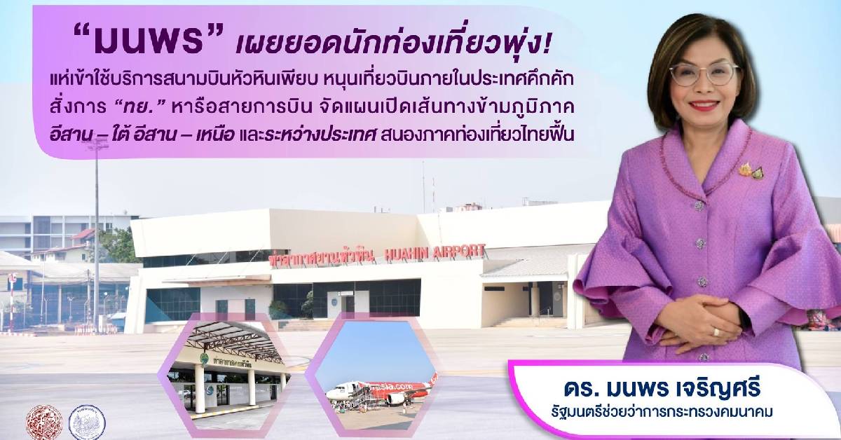 กรุงเทพ 13 ธ.ค.- “มนพร” เผยยอดนักท่องเที่ยวพุ่ง! แห่เข้าใช้บริการสนามบินหัวหินเพียบ หนุนเที่ยวบินภายในประเทศคึกคัก สั่งการ “ทย.” หารือสายการบิน จัดแผนเปิดเส้นทางข้ามภูมิภาค อีสาน-ใต้, อีสาน-เหนือ และระหว่างประเทศ สนองภาคท่องเที่ยวไทยฟื้น