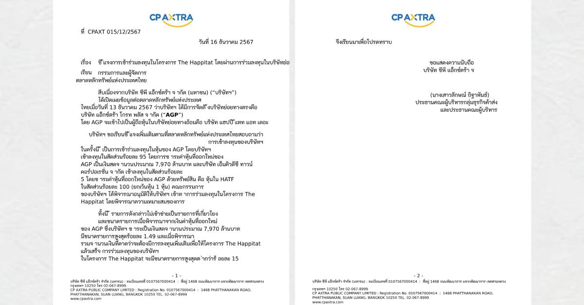 บมจ.ซีพี แอ็กซ์ตร้า (CPAXT) แจ้งตลาดหลักทรัพย์ ว่าตามที่ได้สอบถามถึงการจัดตั้งบริษัทย่อย แอ็กซ์ตร้า โกรท พลัส หรือ AGP โดย AGP จะเข้าไปเป็นผู้ถือหุ้นในบริษัทย่อยทางอ้อมคือ บริษัท แฮปปี้้แทท แอท เดอะ ฟอเรสเทียส์ จำกัด (“HATF”) ประกอบธุรกิจพัฒนาอสังหาริมทรัพย์แบบผสมผสาน (Mixed-Use Development) ภายใต้โครงการชื่อ The Happitat โดยรายละเอียดคือบริษัทฯ เข้าลงทุนในสัดส่วนร้อยละ 95 ชำระค่าหุ้นที่ออกใหม่ของ AGP เป็นเงินสด 7,970 ล้านบาท และบริษัท เอ็มคิวดีซี ทาวน์ คอร์ปอเรชั่น เข้าลงทุนในสัดส่วนร้อยละ 5 โดยชำระค่าหุ้นด้วยทรัพย์สิน คือ หุ้นใน HATF ในสัดส่วนร้อยละ 100 (ยกเว้นหุ้น 1 หุ้น)