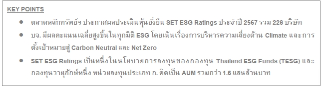 ผู้สนใจสามารถดูผลประเมินหุ้นยั่งยืน SET ESG Ratings ปี 2567 ที่ www.setsustainability.com/ESG-ratings สำหรับการยกระดับการประเมิน SET ESG Ratings สู่มาตรฐานสากล FTSE Russell ESG Scores ที่ได้รับการยอมรับจากผู้ลงทุนสถาบันทั่วโลก โดยตลาดหลักทรัพย์ฯ จะประกาศผลประเมินสู่สาธารณะตั้งแต่ปี 2569 เป็นต้นไป. -511- สำนักข่าวไทย