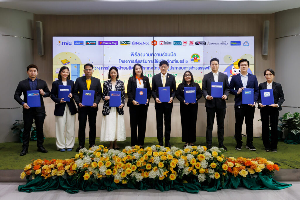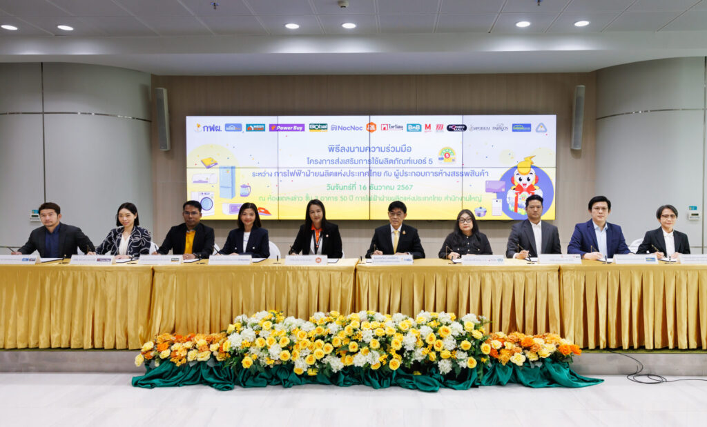 นายเทพรัตน์ เทพพิทักษ์ ผู้ว่าการการไฟฟ้าฝ่ายผลิตแห่งประเทศไทย (กฟผ.) แถลงข่าวเปิดตัวกิจกรรม กฟผ. ส่งความสุขปีใหม่ คนไทยใส่ใจรักษ์โลกพร้อมลงนามความร่วมมือโครงการส่งเสริมการใช้ผลิตภัณฑ์เบอร์ 5 ระหว่าง กฟผ. กับผู้ประกอบการห้างสรรพสินค้า จำนวน 9 ราย ระบุร่วมสนองนโยบายรัฐบาลและกระทรวงพลังงานด้วยการมอบของขวัญให้กับคนไทยเพื่อร่วมเฉลิมฉลองเทศกาลแห่งความสุขส่งท้ายปีเก่าต้อนรับปีใหม่กับ 3 แคมเปญ “กฟผ. ส่งความสุขปีใหม่ คนไทยใส่ใจรักษ์โลก”
