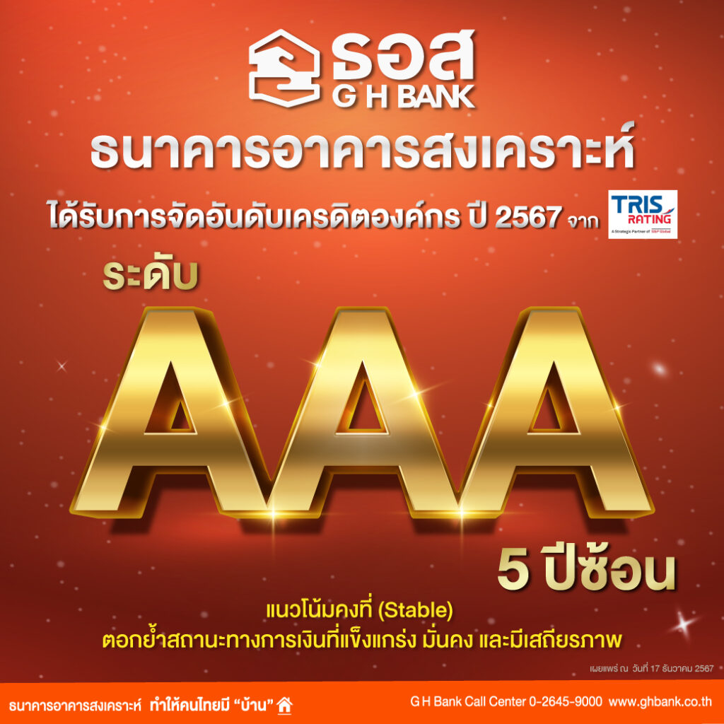 ธอส. 17 ธ.ค.- ธนาคารอาคารสงเคราะห์ (ธอส.) เผย ทริสเรทติ้ง ประกาศการจัดอันดับเครดิตองค์กรของ ธอส. ปี 2567 โดยคงอันดับเครดิตองค์กรในระดับ AAA เป็นปีที่ 5 ติดต่อกัน และแนวโน้มอันดับเครดิตของ ธอส. ที่ระดับคงที่ (Stable) ตอกย้ำความแข็งแกร่งของสถานะทางการเงินและการเป็นผู้นำด้านสินเชื่อที่อยู่อาศัยของธนาคาร