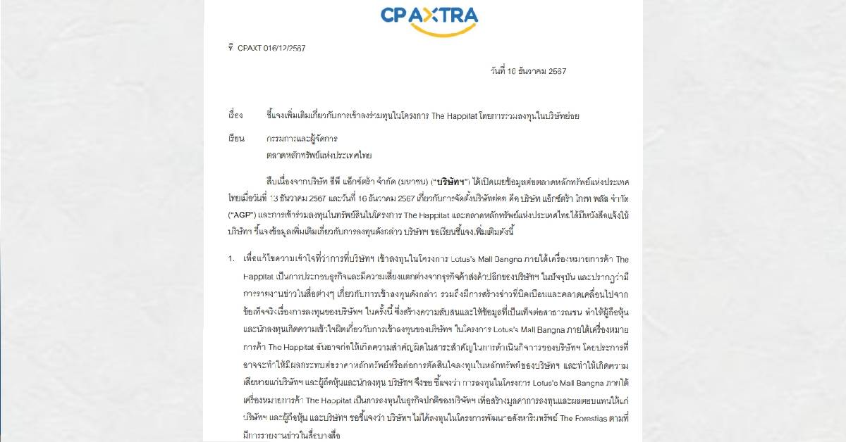 นางเสาวลักษณ์ ถิฐาพันธ์ ประธานคณะผู้บริหารกลุ่มธุรกิจค้าส่ง และประธานคณะผู้บริหารกลุ่มธุรกิจสายงานการเงินการบัญชี และบริหารหารงานกลาง CPAXT แจ้งว่า ในช่วงที่ผ่านมา มีข่าวเรื่องการเข้าลงทุนของบริษัท ซึ่งข้อมูลบางส่วนในโซเชียลมีเดีย อาจทำให้นักลงทุนเกิดความเข้าใจที่คลาดเคลื่อน ล่าสุดบริษัทจึงออกมาชี้แจงแสดงความชัดเจนเพื่อคลายความกังวลของนักลงทุน โดยย้ำจุดยืนในการดำเนินการ เพื่อประโยชน์สูงสุดของผู้ถือหุ้น และการเติบโตของบริษัทฯ
