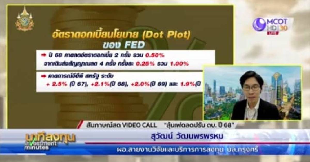 ส่วนการคาดการณ์อัตราดอกเบี้ยนโยบาย (Dot Plot) นั้น เจ้าหน้าที่เฟดส่งสัญญาณปรับลดอัตราดอกเบี้ยในปี 2568 ลงเพียง 2 ครั้ง ครั้งละ 0.25% รวม 0.50% จากเดิมที่ส่งสัญญาณในเดือน ก.ย.ว่าจะปรับลดดอกเบี้ย 4 ครั้ง รวม 1.00% ในปีหน้า และคาดการณ์การขยายตัวของเศรษฐกิจสหรัฐฯ ในปี 2567, 2568, 2569 และ 2570 ที่ระดับ 2.5%, 2.1%, 2.0% และ 1.9% ตามลำดับ เพิ่มขึ้นจากเดิมที่คาดการณ์ในเดือนก.ย.ว่าจะขยายตัว 2.0% ทุกปี
