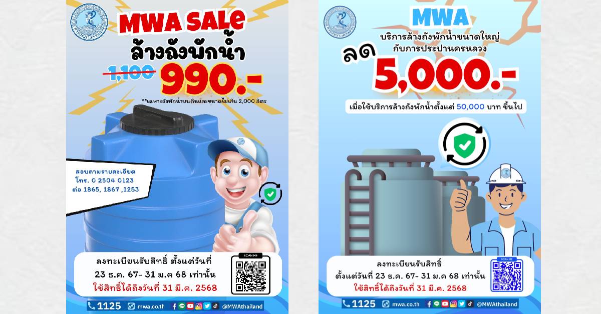 กปน.แจ้งว่า ส่วนลดค่าบริการล้างถังพักน้ำ ได้แก่ ถังพักน้ำบนดินขนาดไม่เกิน 2 ลูกบาศก์เมตร (2,000 ลิตร) เหลือเพียง 990 บาทต่อถัง (จากราคาปกติ 1,100 บาท) และถังพักน้ำขนาดใหญ่ 10 ลูกบาศก์เมตรขึ้นไป (10,000 ลิตร ขึ้นไป) รับส่วนลดมูลค่า 5,000 บาท ต่อหมายเลขทะเบียนผู้ใช้น้ำ เมื่อรับบริการล้างถังพักน้ำขนาดใหญ่ตั้งแต่ 50,000 บาท ขึ้นไป ลงทะเบียนขอรับบริการผ่าน QR Code ได้ตั้งแต่วันที่ 23 ธันวาคม 2567 ถึง 31 มกราคม 2568 และใช้สิทธิ์รับบริการได้ถึงวันที่ 31 มีนาคม 2568 เท่านั้น ให้บริการทุกวัน เวลา 08.30 – 16.30 น. ไม่เว้นวันหยุดนักขัตฤกษ์ สอบถามข้อมูลเพิ่มเติมได้ที่ MWA call center โทร. 1125 ตลอด 24 ชั่วโมง หรือ 0 2504 0123 ต่อ 1865, 1867, 1253