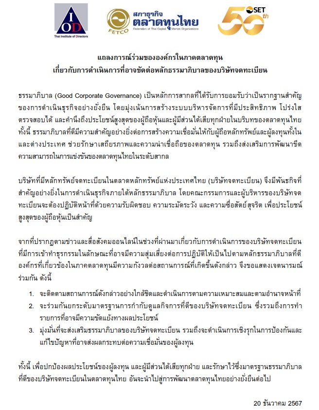 จากที่ปรากฏตามข่าวและสื่อสังคมออนไลน์ในช่วงที่ผ่านมาเกี่ยวกับการดำเนินการของบริษัทจดทะเบียนที่มีการเข้าทำธุรกรรมในลักษณะที่อาจมีความสุ่มเสี่ยงต่อการปฏิบัติให้เป็นไปตามหลักธรรมาภิบาลที่ดี องค์กรที่เกี่ยวข้องในภาคตลาดทุนมีความกังวลต่อสถานการณ์ที่เกิดขึ้นดังกล่าว จึงขอแสดงเจตนารมณ์ร่วมกัน ดังนี้