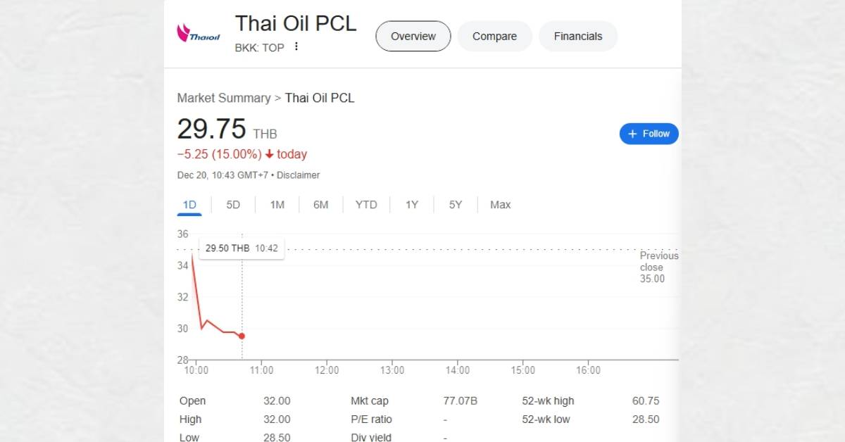 กรุงเทพฯ 20 ธ.ค. – ราคาหุ้น บมจ.ไทยออยล์ (TOP) ร่วงหนัก โดยเวลา 10.43 น.ร่วง 5.25 บาท มาที่ 29.75 บาท หลัง “บอร์ดไทยออยล์” ไฟเขียวเพิ่มงบประมาณโครงการพลังงานสะอาด (CFP) 63,028 ล้านบาท และดอกเบี้ยระหว่างการก่อสร้างประมาณ 17,922 ล้านบาท เตรียมเสนอเข้าที่ประชุมวิสามัญผู้ถือหุ้น 21 ก.พ.68 โดยงบก่อสร้างก่อนเพิ่มเงินอยู่ที่ประมาณ 5,375 ล้านดอลลาร์