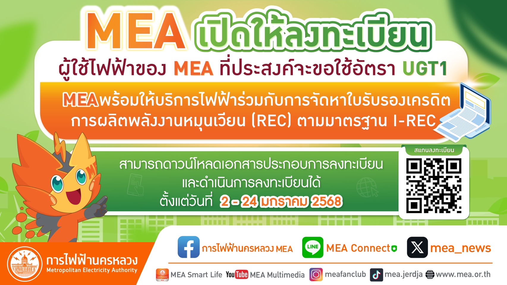 ทั้งนี้ ผู้ใช้ไฟฟ้าที่ประสงค์จะขอใช้บริการอัตรา UGT1 และอยู่ในพื้นที่ให้บริการของ MEA (กรุงเทพมหานคร นนทบุรี และสมุทรปราการ) สามารถดาวน์โหลดเอกสารประกอบการลงทะเบียน และดำเนินการลงทะเบียนได้ ตั้งแต่วันที่ 2-24 มกราคม 2568 ผ่านลิงก์ https://eservice.mea.or.th/ugt/