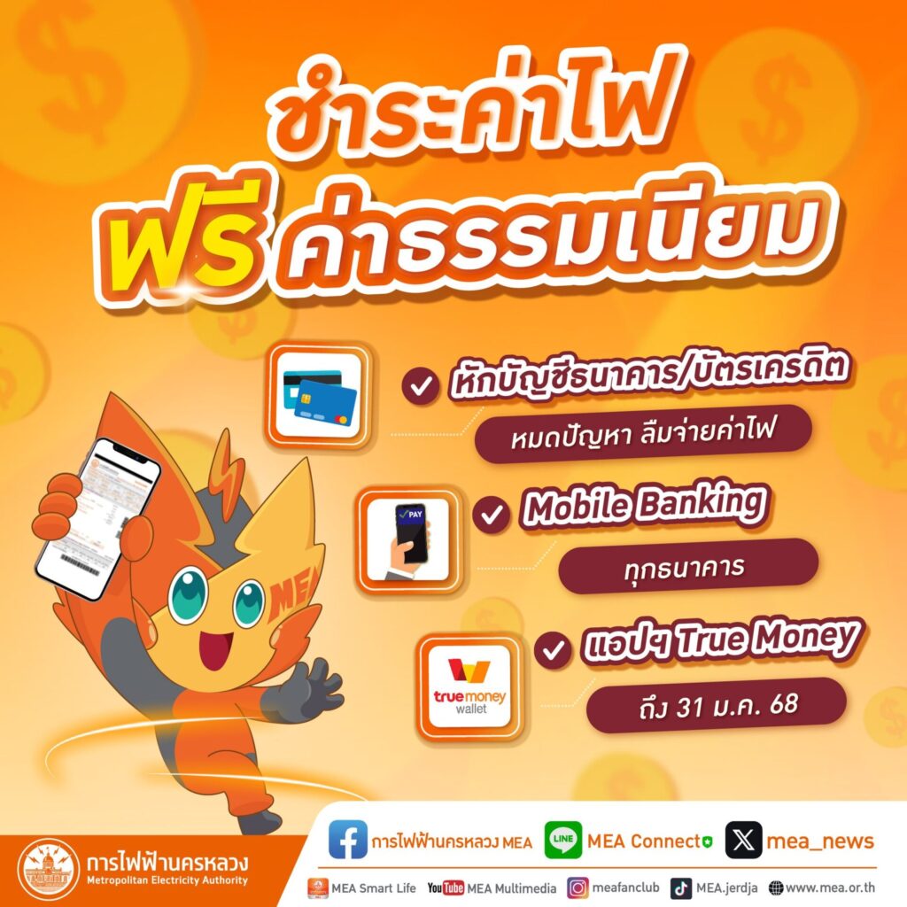 23 ธ.ค. – PEA ชี้เป้า วิธีจ่ายค่าไฟ แบบไม่มีค่าธรรมเนียม