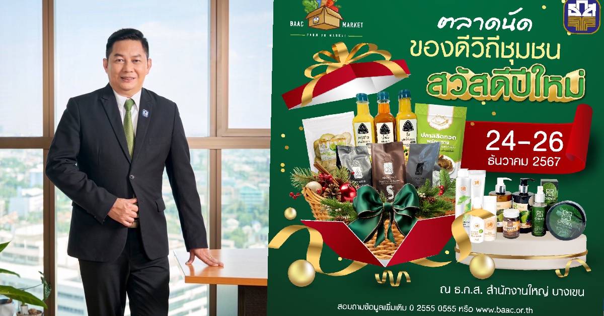 นายไพศาล หงษ์ทอง รองผู้จัดการธนาคารเพื่อการเกษตรและสหกรณ์การเกษตร (ธ.ก.ส.) เปิดเผยว่า เพื่อต้อนรับเทศกาลปีใหม่ 2568 ธ.ก.ส.ได้จัดงานตลาดนัดของดีวิถีชุมชน ภายใต้ธีม “Happy New Year 2025” คัดสรรและรวบรวมสินค้าดีมีคุณภาพจากเกษตรกรกว่า 50 ร้านค้าจากทุกภูมิภาคมาจัดจำหน่ายให้เลือก ซื้อเป็นของขวัญและของฝากสุดประทับใจมอบให้กับคนที่รักในราคาพิเศษ ไม่ว่าจะเป็นชุดกระเช้าของขวัญผลิตภัณฑ์ผ้าทอพื้นถิ่น สมุนไพร อาหารเครื่องดื่ม และของใช้ อาทิ จันจาโปรดักส์ กรุงเทพมหานคร การผสมผสานบาติก กับผ้าฝ้ายผลิตเป็นสินค้าใหม่หลากหลายรูปแบบ Limited ที่ไม่เหมือนใคร เช่น เสื้อผ้า กระเป๋า ซะป๊ะผ้าไทย จังหวัดเชียงใหม่ ร้านดังดอยสะเก็ด ผู้ผลิตสินค้าพื้นเมืองกลุ่มผ้าถักทอ ที่สวมใส่สบายในทุกโอกาส ไม่หดไม่ร้อน มีให้เลือกหลากหลายคอลเลคชั่น วิสาหกิจชุมชนรุ่งเรืองพัฒนากาแฟเทพเสด็จ ผู้ผลิตกาแฟชาพรีเมี่ยมที่มีเอกลักษณ์ความหอมละมุนกลมกล่อมจากดอยเทพเสด็จ จังหวัดเชียงใหม่
