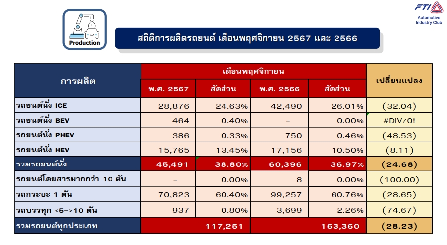 นายสุรพงษ์ ไพสิฐพัฒนพงษ์ ที่ปรึกษาประธานกลุ่มอุตสาหกรรมยานยนต์และโฆษกกลุ่มอุตสาหกรรมยานยนต์ สภาอุตสาหกรรมแห่งประเทศไทย (ส.อ.ท.) เปิดเผยว่าเดือนพฤศจิกายน 2567 ผลิตรถยนต์ได้ 117,251 คัน ลดลงจากเดือนเดียวกันของปีก่อน ร้อยละ 28.23 จากการผลิตส่งออกลดลงร้อยละ 20.67 และผลิตเพื่อจำหน่ายในประเทศลดลงร้อยละ 40.42 และลดลงจากเดือนตุลาคม 2567 ร้อยละ 1.34 ส่งผลให้จำนวนรถยนต์ที่ผลิตได้ในช่วง 11 เดือน (มกราคม – พฤศจิกายน) มีจำนวนทั้งสิ้น 1,364,119 คัน ลดลงจากเดือนมกราคม – พฤศจิกายน 2566 ร้อยละ 20.14 เมื่อดูตัวเลขเฉพาะรถยนต์นั่ง พบว่า ผลิตได้ 45,491 คัน ลดลงจากปีที่แล้ว ร้อยละ 24.68 โดยแบ่งเป็น