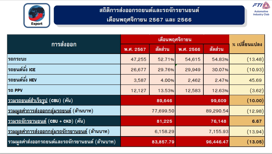 ขณะที่ยานยนต์ไฟฟ้าป้ายแดงประเภท BEV เดือนพฤศจิกายน จดทะเบียนใหม่จำนวน 7,354 คัน ลดลงจากเดือนพฤศจิกายนปีที่แล้วร้อยละ 34.86 ส่งผลให้เดือนมกราคม – พฤศจิกายน มียานยนต์ประเภทไฟฟ้า (BEV) จดทะเบียนใหม่สะสม 89,658 คัน เพิ่มขึ้นจากเดือนมกราคม – พฤศจิกายนปีที่แล้วร้อยละ 0.94 ยานยนต์ไฟฟ้าป้ายแดงประเภท HEV จดทะเบียนใหม่มีจำนวน 8,409 คัน เพิ่มขึ้นจากเดือนพฤศจิกายนปีที่แล้วร้อยละ 11.76 และยานยนต์ไฟฟ้าป้ายแดงประเภท PHEV จดทะเบียนใหม่มีจำนวน 768 คัน ลดลงจากเดือนพฤศจิกายนปีที่แล้วร้อยละ 2.17 2567 ยานยนต์ไฟฟ้าจดทะเบียนสะสมประเภท BEV ณ วันที่ 31 พฤศจิกายน มีจำนวนทั้งสิ้น 220,439คัน เพิ่มขึ้นจากปีที่แล้วร้อยละ 82.61 รวมมูลค่าการส่งออกรถยนต์สำเร็จรูป เครื่องยนต์ ชิ้นส่วนอื่นๆ อะไหล่รถยนต์ รถจักรยานยนต์ ชิ้นส่วน และอะไหล่รถจักรยานยนต์ มีทั้งสิ้น 942,717.96 ล้านบาท ลดลงจากปี 2566 ร้อยละ 1.37