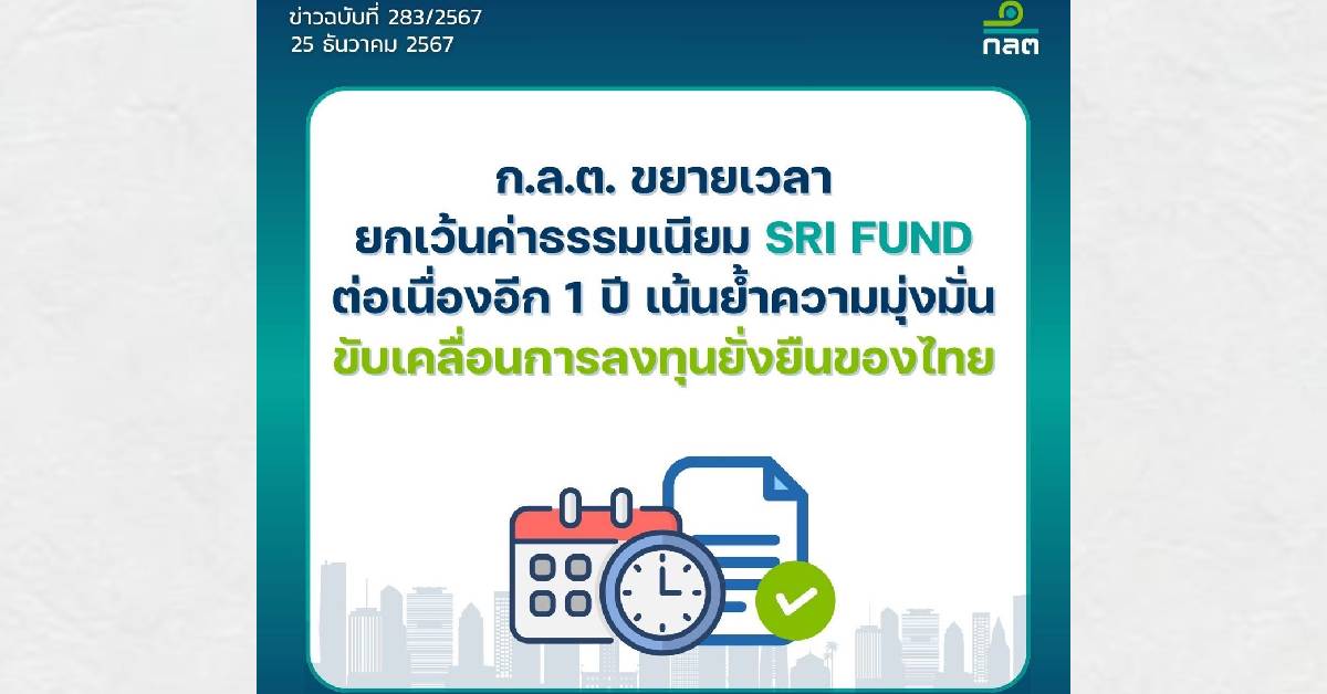 กรุงเทพฯ 23 ธ.ค. – ก.ล.ต.ออกประกาศขยายเวลาการยกเว้นค่าธรรมเนียมการจัดตั้งและแก้ไขโครงการจัดการกองทุนรวมเพื่อเป็น SRI Fund รวมถึง Thai ESG ออกไปอีก 1 ปี จากเดิมจะสิ้นสุดในเดือน ธ.ค.2567 เพื่อเร่งเครื่องสนับสนุนการลงทุนในหุ้นกลุ่ม value up และผลักดันการลงทุนที่ยั่งยืนในประเทศไทย