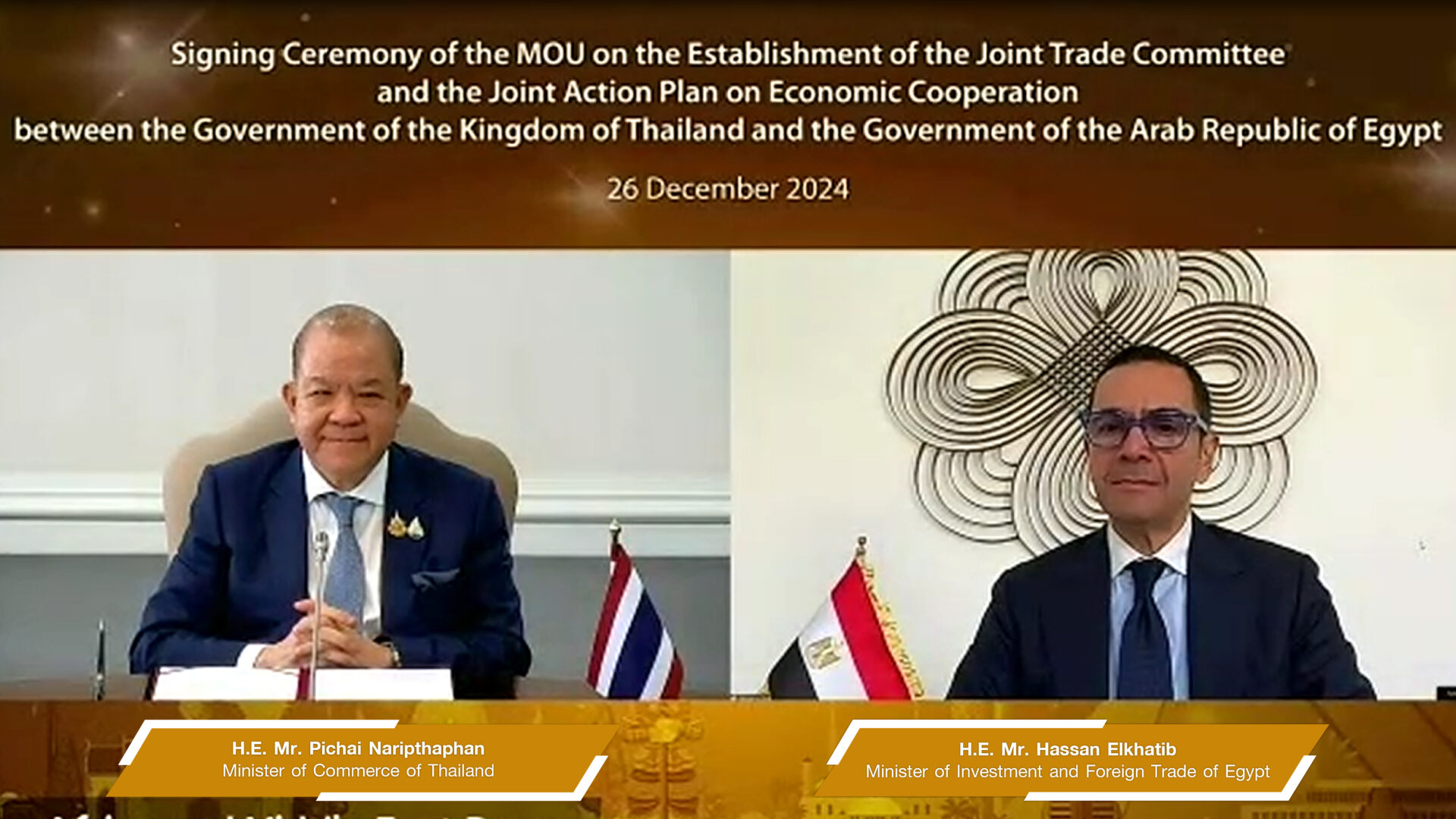 นายพิชัย นริพทะพันธุ์ รัฐมนตรีว่าการกระทรวงพาณิชย์ เปิดเผยว่า เมื่อวันที่ 26 ธันวาคม 2567 ได้ร่วมลงนามบันทึกความเข้าใจ (MOU) และ รัฐมนตรีว่าการกระทรวงการลงทุนและการค้าต่างประเทศของอียิปต์ (นายฮัสซัน เอล-คาติบ) จัดตั้งคณะกรรมการร่วมทางการค้าไทย-อียิปต์ และแผนปฏิบัติการร่วมว่าด้วยความร่วมมือทางเศรษฐกิจระหว่างไทยกับอียิปต์ ผ่านระบบการประชุมทางไกล ตามที่คณะรัฐมนตรีได้ให้ความเห็นชอบเมื่อต้นเดือนธันวาคมที่ผ่านมา นับเป็นก้าวสำคัญในการเสริมสร้างความสัมพันธ์ให้ใกล้ชิดยิ่งขึ้น และเป็นส่วนหนึ่งของการฉลองความสัมพันธ์ครบรอบ 70 ปี ระหว่างสองประเทศในปี 2567 นี้ด้วย