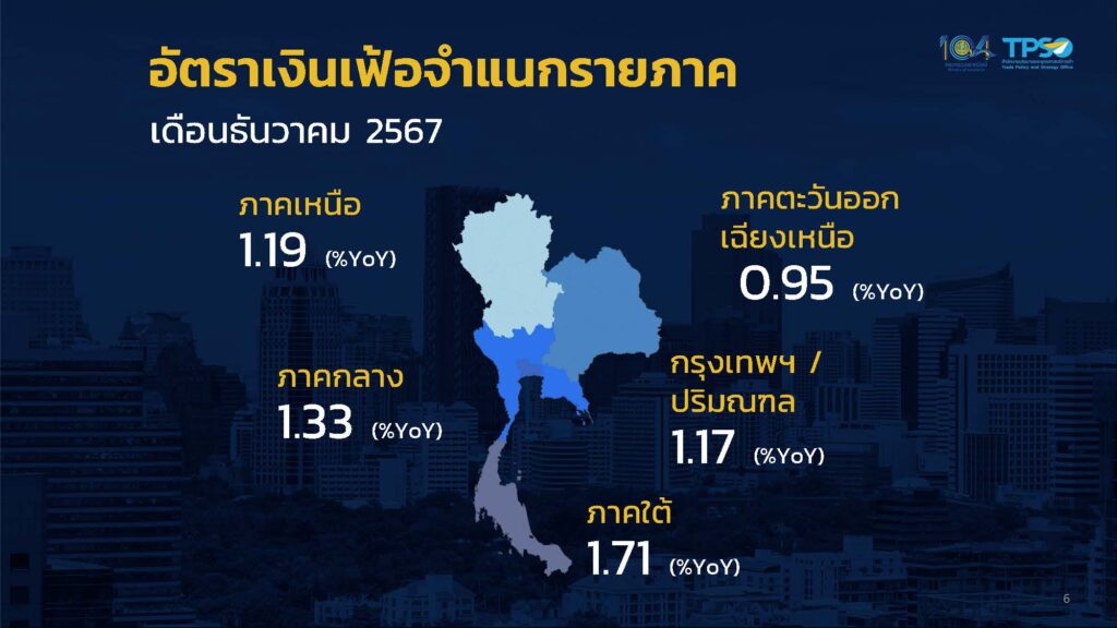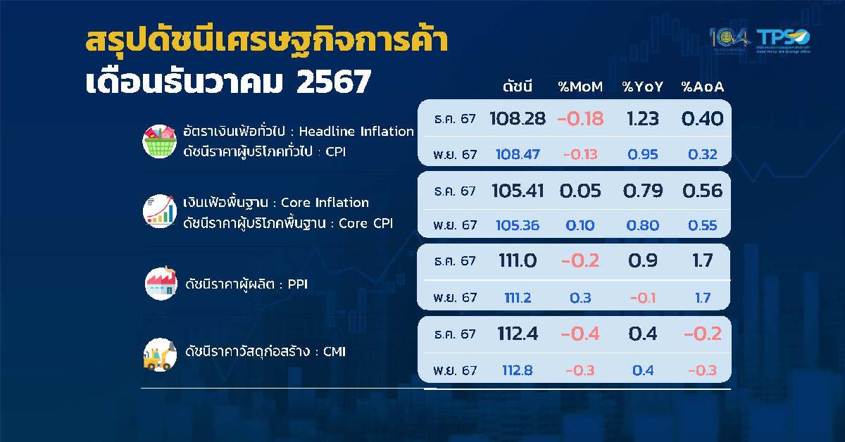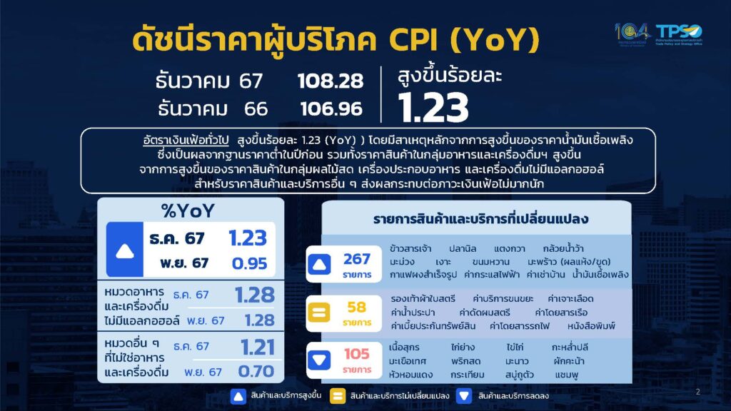 นายพูนพงษ์ นัยนาภากรณ์ ผู้อำนวยการสำนักงานนโยบายและยุทธศาสตร์การค้า (สนค.) กระทรวงพาณิชย์ เปิดเผยว่า ดัชนีราคาผู้บริโภคทั่วไปเดือนธันวาคม 2567 อยู่ที่ 108.28 เมื่อเทียบกับปีที่แล้ว สูงขึ้น 1.23% ปัจจัยหลักมาจากการสูงขึ้นของราคาน้ำมันเชื้อเพลิง รวมถึงสินค้าในกลุ่มอาหารและเครื่องดื่มปรับตัวสูงขึ้น จากราคาผลไม้เครื่องประกอบอาหารและเครื่องดื่มไม่มีแอลกอฮอล์สำหรับราคาสินค้าและบริการอื่นๆส่งผลกระทบต่อภาวะเงินเฟ้อไม่มาก