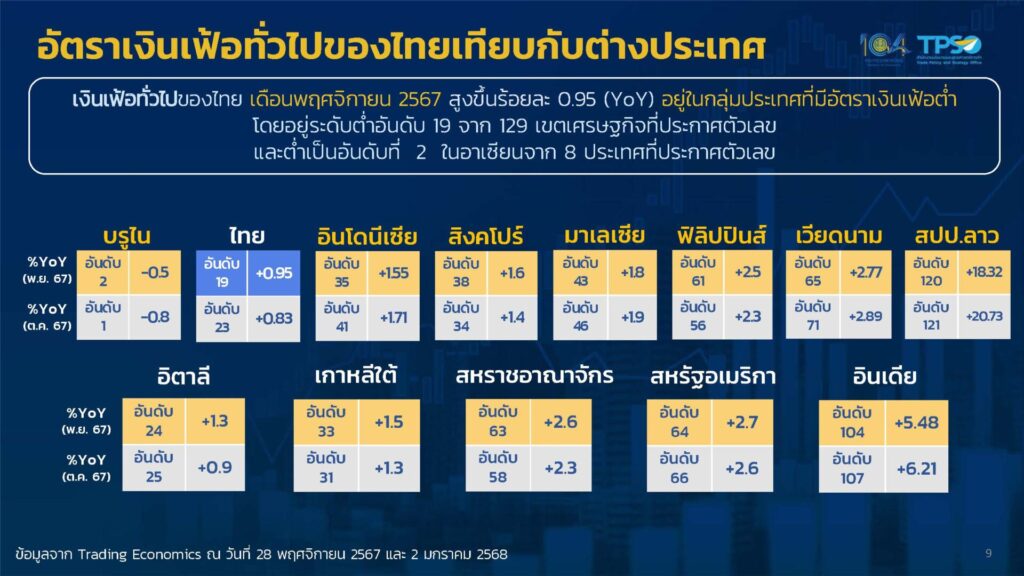ขณะที่ปัจจัยที่กดดันให้อัตราเงินเฟ้อทั่วไปลดลง ประกอบด้วย 1. ภาครัฐมีแนวโน้มดำเนินมาตรการช่วยเหลือลดภาระค่าครองชีพอย่างต่อเนื่อง โดยเฉพาะการปรับลดค่าไฟฟ้าและการตรึงราคาก๊าซ LPG 2. ฐานราคาผักและผลไม้สด ปี 2567 อยู่ในระดับสูง ซึ่งเป็นผลจากสถานการณ์เอลนีโญและลานีญา ขระที่ในปี 2568 คาดว่าสถานการณ์ดังกล่าวจะไม่รุนแรงและส่งผลกระทบไม่มาก และ 3.การชะลอตัวของภาคอสังหาริมทรัพย์ และการจำหน่ายรถยนต์ภายในประเทศ จะส่งผลให้ค่าเช่าบ้านและราคารถยนต์เพิ่มขึ้นอย่างจำกัด