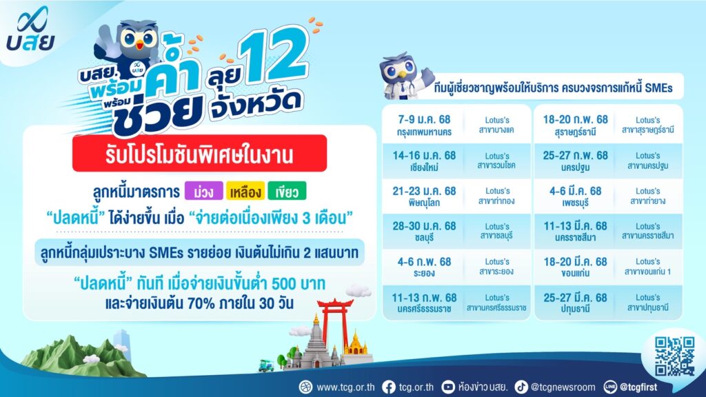 บสย.ขานรับนโยบายภาครัฐ เร่งช่วย SMEs ลูกหนี้ที่ บสย. จ่ายเคลม ลด ปลด หนี้ ส่งมาตรการ “บสย. พร้อมช่วย” ปี 2568 ปรับเงื่อนไขช่วย SMEs ปลดหนี้ได้ง่ายขึ้น ชูมาตรการใหม่ แก้หนี้ “กลุ่มเปราะบาง” เงินต้นไม่เกิน 2 แสน ลดเงินต้นถึง 30% สูงสุดที่ บสย. เคยทำมา พร้อมคิกออฟเปิดตัวโครงการ “บสย. พร้อมค้ำ พร้อมช่วย” ระดมทีมงานเดินสายออกบูธโลตัส 12 แห่งทั่วประเทศ กับโปรโมชันพิเศษเฉพาะในงาน ช่วยลูกหนี้ที่ปรับปรุงโครงสร้างหนี้กับ บสย. สามารถ “ปลดหนี้” ได้เร็วขึ้น เมื่อจ่ายต่อเนื่องเพียง 3 เดือน