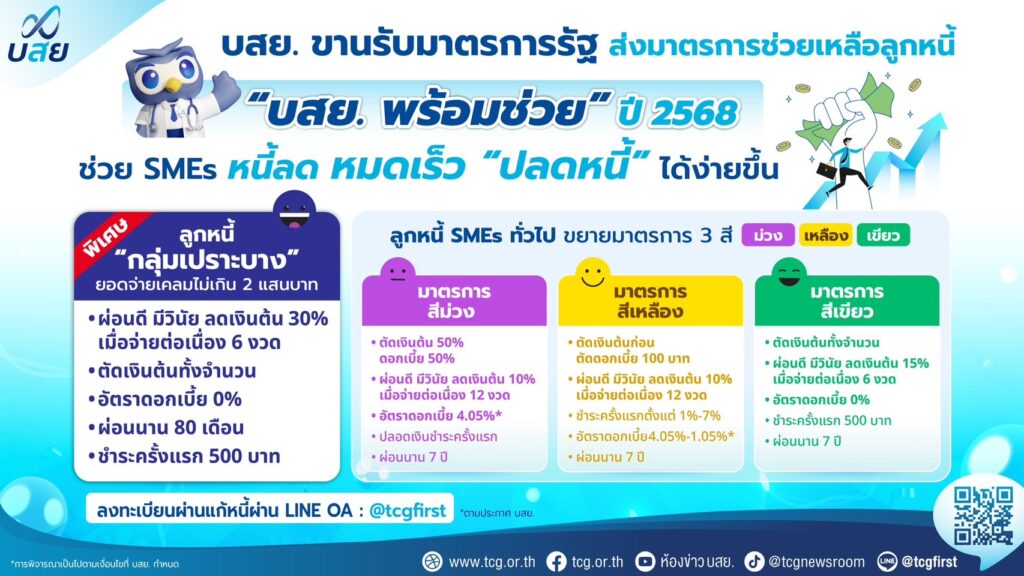 จุดเด่นของมาตรการนี้ เน้นออกแบบเพื่อรองรับกับความสามารถในการชำระหนี้ 3 ระดับ (ม่วง เหลือง เขียว) สำหรับมาตรการสีม่วง “ลูกหนี้ดี แรงผ่อนน้อย” เพิ่มระยะเวลาการผ่อนชำระจาก 4 ปี เป็น 7 ปี ตัดเงินต้นเพิ่มเป็นร้อยละ 50 จากเดิมตัดเงินต้นร้อยละ 20 และสามารถปลดหนี้ ลดต้นร้อยละ 10 เมื่อจ่ายต่อเนื่อง 12 งวด, มาตรการสีเหลือง “ลูกหนี้ผ่อนดี มีศักยภาพ” เพิ่มระยะเวลาการผ่อนชำระหนี้จาก 4 ปี เป็น 7 ปี และสามารถปลดหนี้ ลดต้นร้อยละ 10 เมื่อจ่ายต่อเนื่อง 12 งวด และมาตรการสีเขียว “ลูกหนี้ดี มีวินัย” เป็นการตัดเงินต้นทั้งจำนวน และสามารถปลดหนี้ ลดต้นสูงถึงร้อยละ 15 เมื่อจ่ายต่อเนื่อง 6 งวด เป็นต้น เพื่อให้ความช่วยเหลือผู้ประกอบการ SMEs ในทุกกลุ่มได้มากยิ่งขึ้น ตอบโจทย์มาตรการแก้หนี้ของภาครัฐ คณะกรรมการ บสย. ยังได้อนุมัติมาตรการแก้หนี้ เพื่อช่วยเหลือ SMEs ลูกหนี้ “กลุ่มเปราะบาง” ของ บสย. (ผู้ประกอบการ SMEs ที่ บสย. จ่ายค่าประกันชดเชย) ที่มีเงินต้นไม่เกิน 2 แสนบาท ปัจจุบันมีจำนวนกว่า 1 แสนราย โดยคิดอัตราดอกเบี้ย 0% ชำระครั้งแรกเพียง 500 บาท ผ่อนสูงสุด 80 เดือน ตัดเงินต้นทั้งจำนวน ค่างวดขั้นต่ำเพียง 500-2,500 บาท และสามารถปลดหนี้ ลดต้นสูงถึงร้อยละ 30 เมื่อจ่ายต่อเนื่อง 6 งวด ซึ่งถือเป็นเปอร์เซ็นต์ที่สูงที่สุดเท่าที่ บสย. เคยทำมา เพื่อช่วย SMEs รายย่อย พ่อค้า แม่ค้า อาชีพอิสระ ให้สามารถปลดหนี้ได้ง่ายขึ้น เร็วขึ้น ช่วยต่อลมหายใจและสามารถเดินหน้ากิจการต่อได้อย่างยั่งยืน