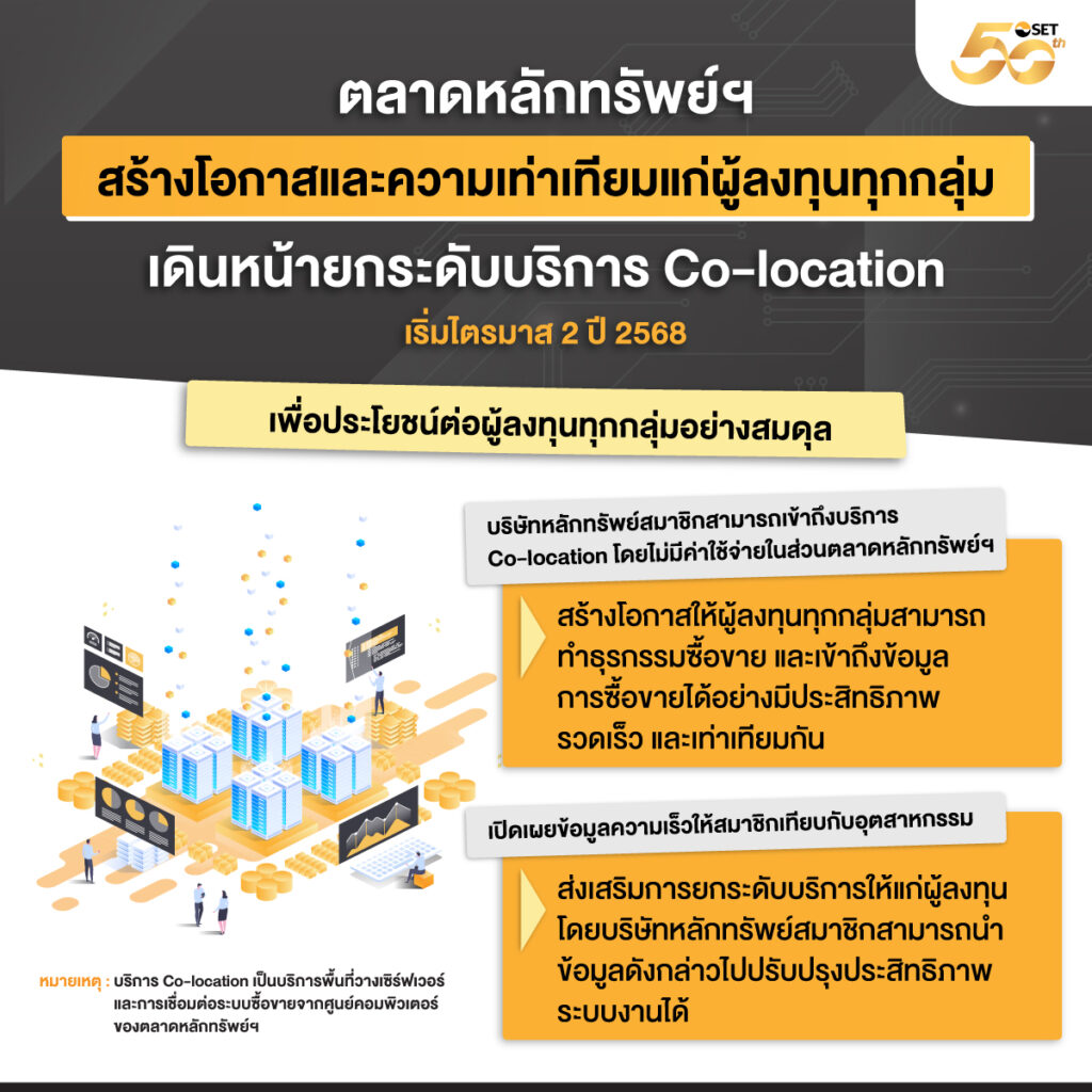 นายอัสสเดช คงสิริ กรรมการและผู้จัดการ ตลาดหลักทรัพย์แห่งประเทศไทย กล่าวว่า ตลาดหลักทรัพย์ฯ มุ่งสร้างโอกาสและความเท่าเทียม เพื่อประโยชน์ต่อผู้ลงทุนทุกกลุ่มอย่างสมดุล โดยมีแผนสนับสนุนให้บริษัทหลักทรัพย์สมาชิกทุกรายสามารถเข้าถึงบริการ Co-location ซึ่งเป็นบริการพื้นที่วางเซิร์ฟเวอร์และการเชื่อมต่อระบบซื้อขายจากศูนย์คอมพิวเตอร์ของตลาดหลักทรัพย์ฯ ได้อย่างทั่วถึง ภายในไตรมาส 2 ปี 2568 เปิดโอกาสให้ผู้ลงทุนทุกกลุ่มสามารถทำธุรกรรมซื้อขาย และเข้าถึงข้อมูลการซื้อขายได้อย่างมีประสิทธิภาพ รวดเร็ว และเท่าเทียม พร้อมส่งเสริมบริษัทหลักทรัพย์สมาชิกในการยกระดับบริการให้แก่ผู้ลงทุน