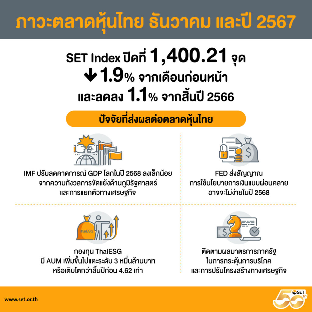 นายศรพล ตุลยะเสถียร รองผู้จัดการ หัวหน้าสายงานวางแผนกลยุทธ์องค์กร ตลาดหลักทรัพย์แห่งประเทศไทย (ตลท.) เปิดเผยภาวะตลาดหลักทรัพย์ไทยเดือนธันวาคม 2567 โดย ณ สิ้นเดือนธันวาคม SET Index ปิดที่ 1,400.21 จุด ทำให้ช่วงครึ่งหลังของปี 2567 SET Index ปรับเพิ่มขึ้น 7.6% ส่งผลให้ตั้งแต่ต้นปีถึงสิ้นเดือนธันวาคม 2567 SET Index ปรับลดลงเพียง 1.1% โดยกลุ่มอุตสาหกรรมที่ปรับตัวดีกว่า SET Index เมื่อเทียบกับสิ้นปี 2566 ได้แก่ กลุ่มเทคโนโลยี และกลุ่มการเงิน