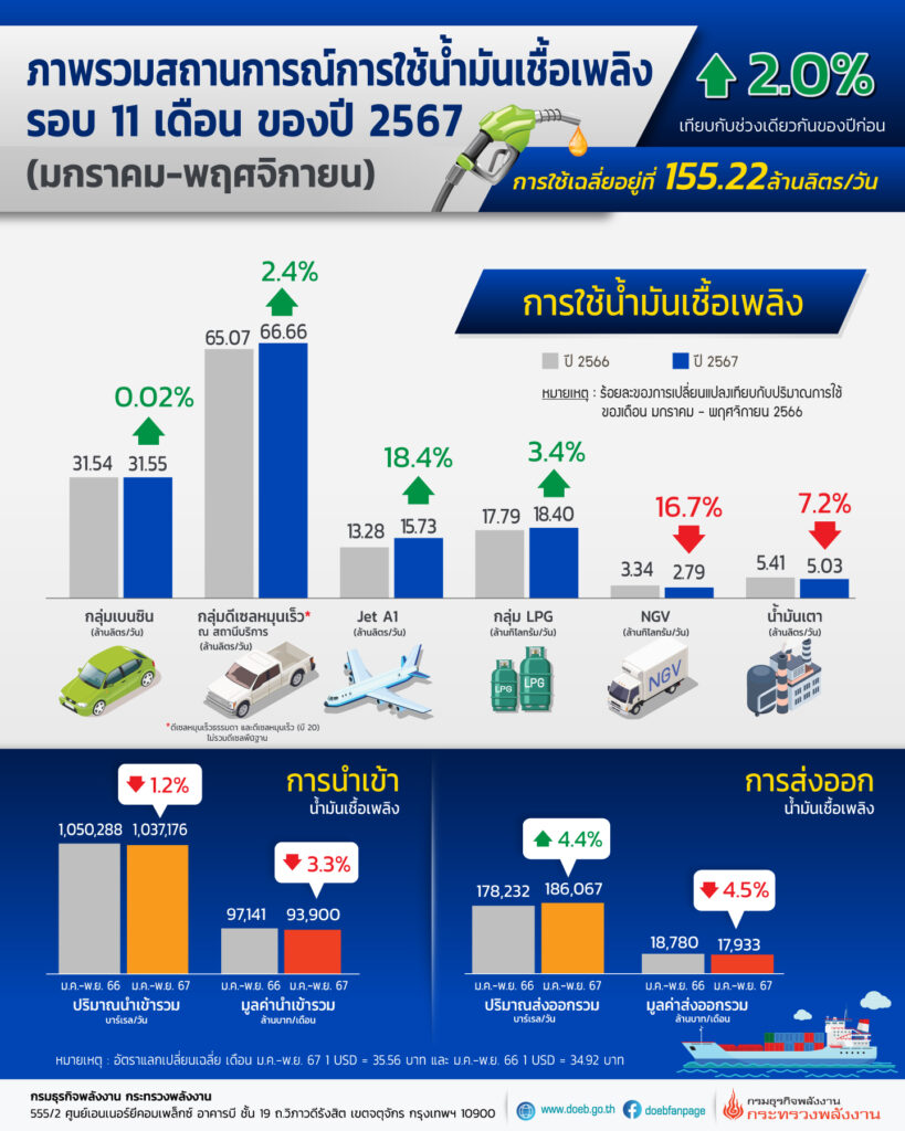 กรุงเทพฯ 9 ม.ค. – การใช้น้ำมันเชื้อเพลิงเฉลี่ยในช่วง 11 เดือน (ม.ค.-พ.ย.67) อยู่ที่ 155.22 ล้านลิตร/วัน เพิ่มขึ้นร้อยละ 2.0 สอดคล้องกับประมาณการขยายตัวของเศรษฐกิจไทยของปี 2567 ร้อยละ 2.6-2.7 จากการฟื้นตัวของภาคท่องเที่ยว และมาตรการกระตุ้นเศรษฐกิจในช่วงปลายปี