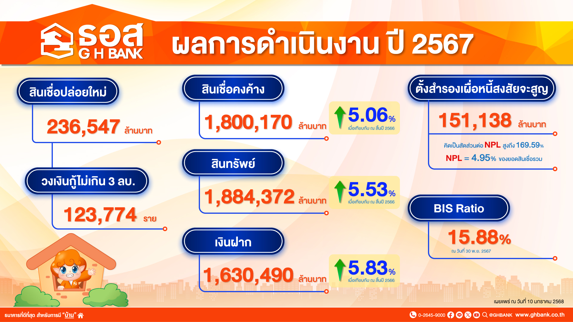 แบ่งเป็นสินเชื่อปล่อยใหม่สำหรับกลุ่มผู้มีรายได้น้อยและปานกลางวงเงินกู้ไม่เกิน 3 ล้านบาท จำนวน 123,774 ราย ส่งผลให้ ณ สิ้นไตรมาสที่ 4/2567 เทียบกับ ณ สิ้นปี 2566 ธอส. มีสินเชื่อคงค้างรวมทั้งสิ้น 1,800,170 ล้านบาท เพิ่มขึ้น 5.06% มีสินทรัพย์รวม 1,884,372 ล้านบาท เพิ่มขึ้น 5.53% และเงินฝากรวม 1,630,490 ล้านบาท เพิ่มขึ้น 5.83% ขณะที่หนี้ที่ไม่ก่อให้เกิดรายได้ (NPL) มีจำนวน 89,117 ล้านบาท คิดเป็น 4.95% ของยอดสินเชื่อรวม ลดลงต่อเนื่องกันเป็นเดือนที่ 5 ซึ่งเป็นผลมาจากการแก้ไขหนี้ให้กับลูกค้าได้อย่างตรงจุด ด้วยการจัดทำมาตรการแก้ไขปัญหาหนี้สินภาคครัวเรือน ปี 2567 และมาตรการช่วยเหลือลูกหนี้