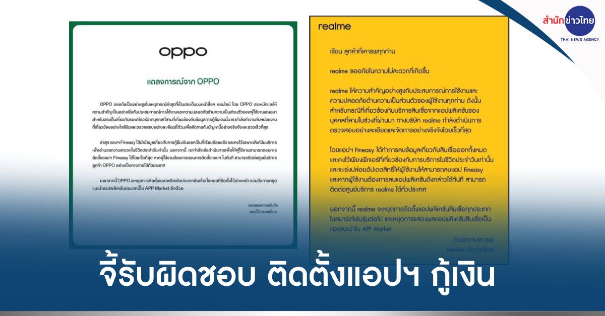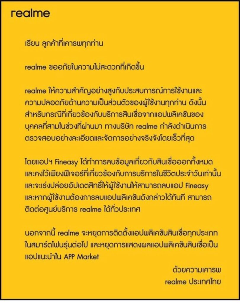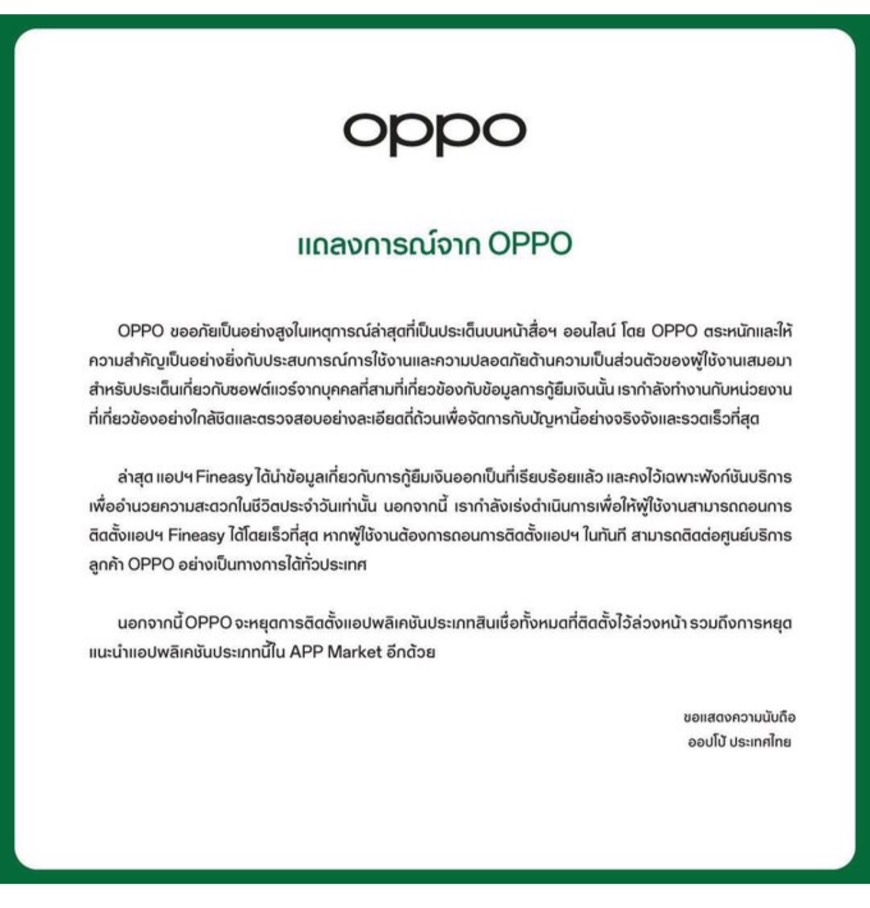 ภายหลังจากที่เพจเฟซบุ๊ก OPPO ประเทศไทย และเพจเฟซบุ๊ก realme ประเทศไทย ได้ออกแถลงการณ์ขออภัยผู้ใช้งานสมาร์ทโฟนทั้ง 2 ยี่ห้อ และพร้อมเร่งดำเนินการให้ ‘ผู้ใช้งาน’ ถอดแอปฯออกจากมือถือได้ ภายหลังมีการร้องเรียนกรณีปรากฏแอปพลิเคชันกู้เงิน ‘สินเชื่อความสุข’ หรือ ‘Fineasy’ ถูกติดตั้งมาพร้อมกับระบบปฏิบัติการ System App บนสมาร์ทโฟนยี่ห้อ OPPO และ realme