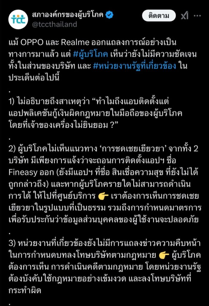 ล่าสุดสภาองค์กรของผู้บริโภค ได้โพสต์ข้อความในโซเชียล ระบุว่าแม้ OPPO และ Realme ออกแถลงการณ์อย่างเป็นทางการมาแล้ว แต่ #ผู้บริโภค เห็นว่ายังไม่มีความชัดเจนทั้งในส่วนของบริษัท และ #หน่วยงานรัฐที่เกี่ยวข้อง ในประเด็นต่อไปนี้