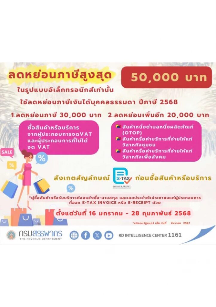 กรุงเทพฯ 13 ม.ค. – กรมสรรพากรชวนใช้สิทธิ “Easy E-Receipt 2.0” ลดหย่อนภาษีสูงสุด 50,000 บาท หวังกระตุ้นการบริโภคในประเทศ เริ่ม 16 ม.ค.-28 ก.พ.68
