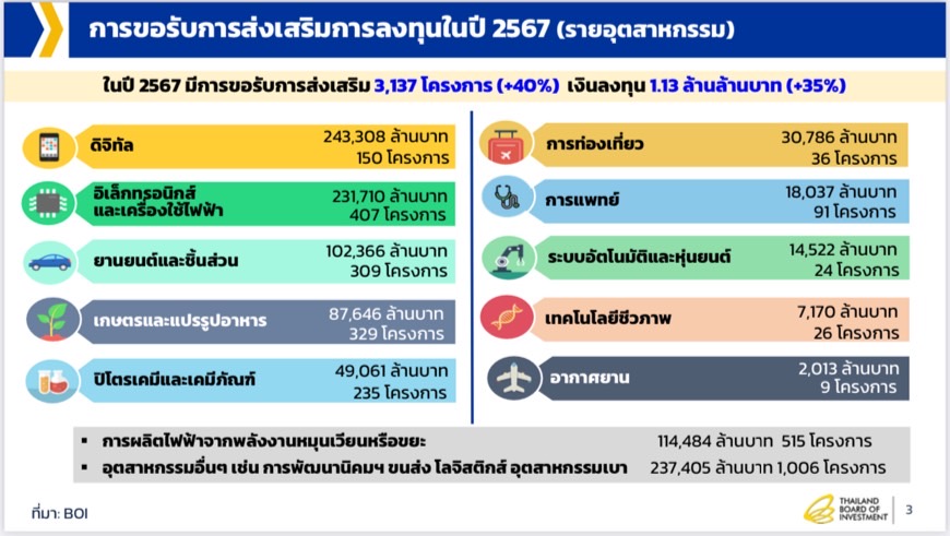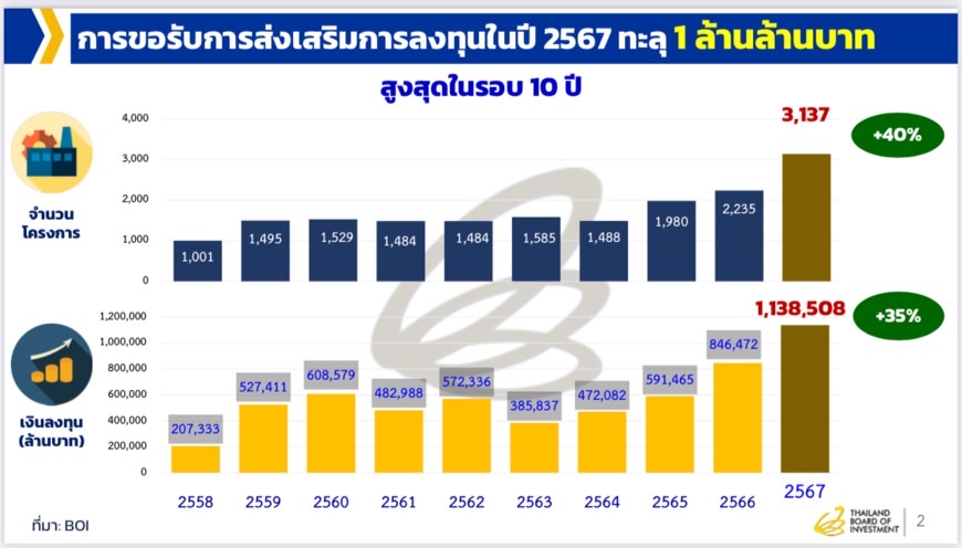 นายนฤตม์ เทอดสถีรศักดิ์ เลขาธิการคณะกรรมการส่งเสริมการลงทุน (บีโอไอ) เปิดเผยว่า ปี 2567 ถือเป็นปีทองของการลงทุนอย่างแท้จริง และเป็นโอกาสครั้งสำคัญของประเทศไทยในการสร้างฐานอุตสาหกรรมใหม่ที่จะนำไปสู่การปรับโครงสร้างเศรษฐกิจไทยในระยะยาว โดยในปี 2567 คำขอรับการส่งเสริมการลงทุนเพิ่มขึ้นอย่างมาก ทั้งจำนวนโครงการและมูลค่าเงินลงทุน โดยมีจำนวน 3,137 โครงการ เพิ่มขึ้นร้อยละ 40 เมื่อเทียบกับปีก่อน นับว่าเป็นยอดจำนวนโครงการที่สูงสุดนับตั้งแต่ก่อตั้งบีโอไอ และมีมูลค่าเงินลงทุน 1,138,508 ล้านบาท เพิ่มขึ้นร้อยละ 35 สูงสุดในรอบ 10 ปี ตอกย้ำถึงความเชื่อมั่นของนักลงทุนที่เห็นว่าประเทศไทยมีความพร้อม ทั้งด้านโครงสร้างพื้นฐาน พื้นที่รองรับอุตสาหกรรม ไฟฟ้าที่มีความเสถียรและมีศักยภาพด้านพลังงานสะอาด บุคลากรที่มีคุณภาพ ซัพพลายเชนที่ครบวงจร ต้นทุนการประกอบธุรกิจที่เหมาะสม มาตรการสนับสนุนต่าง ๆ ของรัฐบาล สิทธิประโยชน์และการบริการต่าง ๆ ของบีโอไอ