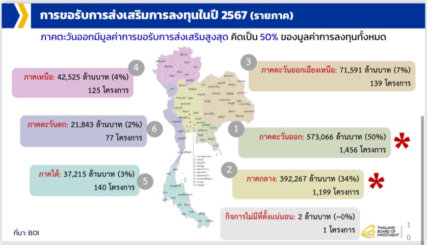 ในแง่พื้นที่ เงินลงทุนส่วนใหญ่อยู่ในพื้นที่ภาคตะวันออก 573,066 ล้านบาท รองลงมา ได้แก่ ภาคกลาง 392,267 ล้านบาท ภาคตะวันออกเฉียงเหนือ 71,591 ล้านบาท ภาคเหนือ 42,525 ล้านบาท ภาคใต้ 37,215 ล้านบาท และภาคตะวันตก 21,843 ล้านบาท ตามลำดับ
