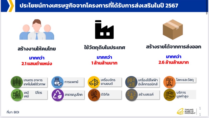 “ท่ามกลางสถานการณ์ที่ท้าทายจากสงครามการค้าและปัญหาภูมิรัฐศาสตร์โลก ประเทศไทยได้พิสูจน์ให้เห็นถึงจุดแข็งในการเป็นแหล่งรองรับการลงทุนที่มีความเป็นกลางและน่าเชื่อถือของภูมิภาค โดยมหาอำนาจทั้งจีนและสหรัฐอเมริกาได้เพิ่มการลงทุนในไทยอย่างต่อเนื่อง รวมถึงกลุ่มนักลงทุนหลักอื่น ๆ ไม่ว่าจะเป็นญี่ปุ่น ฮ่องกง ไต้หวัน และยุโรป ก็ยังเดินหน้าขยายการลงทุนในไทย โดยเฉพาะในอุตสาหกรรมที่ใช้เทคโนโลยีขั้นสูง เช่น เซมิคอนดักเตอร์และอิเล็กทรอนิกส์ขั้นสูง เครื่องใช้ไฟฟ้าอัจฉริยะ ดาต้าเซ็นเตอร์และบริการคลาวด์ที่รองรับเทคโนโลยี AI และดิจิทัลขั้นสูง ยานยนต์ไฟฟ้าและชิ้นส่วนสำคัญ และอุตสาหกรรมเทคโนโลยีชีวภาพ ซึ่งอุตสาหกรรมเหล่านี้จะมีความสำคัญต่อการเพิ่มขีดความสามารถในการแข่งขันและการปรับโครงสร้างเศรษฐกิจไทย ช่วยต่อยอดฐานอุตสาหกรรมเดิมให้มั่นคง สร้างมูลค่าจากเทคโนโลยีสมัยใหม่ สร้างงาน และสร้างโอกาสให้ผู้ประกอบการไทย โดยโครงการที่ได้รับส่งเสริมในปี 2567 จะมีการจ้างงานบุคลากรไทยเพิ่มกว่า 2.1 แสนคน จะใช้วัตถุดิบและชิ้นส่วนในประเทศกว่า 1 ล้านล้านบาทต่อปี และจะเพิ่มมูลค่าส่งออกของประเทศอีกกว่า 2.6 ล้านล้านบาทต่อปี” นายนฤตม์ กล่าว
