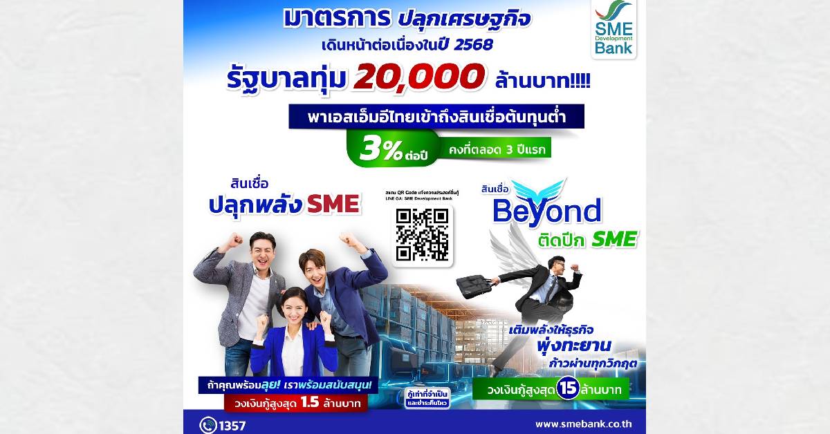 2) โครงการสินเชื่อ Beyond ติดปีก SME วงเงินสินเชื่อ 10,000 ล้านบาท เพื่อเป็นเงินทุนเสริมสภาพคล่อง ลงทุน ขยาย ปรับปรุงกิจการ ปรับเปลี่ยนทรัพย์สินหรือเครื่องจักร เพื่อเพิ่มศักยภาพในการดำเนินธุรกิจให้กับผู้ประกอบการ SME ทั้งบุคคลธรรมดาและนิติบุคคลในทุกภาคธุรกิจที่มีรายได้ต่อปีไม่น้อยกว่า 2 ล้านบาท วงเงินสินเชื่อต่อรายไม่เกิน 15 ล้านบาท คิดอัตราดอกเบี้ยคงที่ในปีที่ 1 – 3 ร้อยละ 3 ต่อปี และในปีที่ 4 – 10 คิดอัตราดอกเบี้ยตามที่ ธพว. กำหนด ระยะเวลากู้สูงสุดไม่เกิน 10 ปี ปลอดชำระเงินต้นสูงสุดไม่เกิน 12 เดือน รับคำขอสินเชื่อถึงวันที่ 30 ธันวาคม 2568