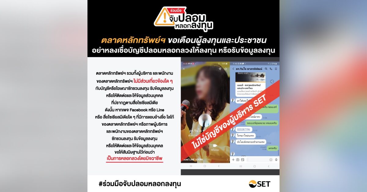 ตามที่มีกลุ่มมิจฉาชีพได้แอบอ้างชื่อและภาพของผู้บริหารตลาดหลักทรัพย์แห่งประเทศไทย (ตลท.) เพื่อนำไปใช้ในการชักชวนหรือหลอกลวงประชาชนทั่วไปให้มาร่วมลงทุน หรือรับข้อมูลการลงทุนผ่านช่องทาง LINE Application นั้น