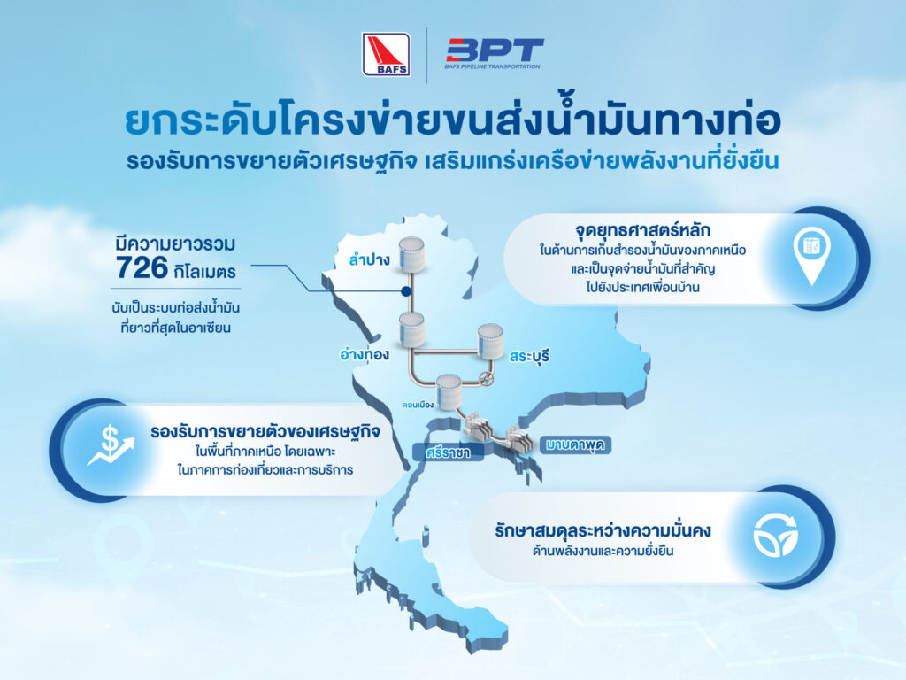 กรุงเทพฯ 20 ม.ค. – บริษัท บาฟส์ขนส่งทางท่อ จำกัด (BPT) ในเครือ บริษัท บริการเชื้อเพลิงการบินกรุงเทพ จำกัด (มหาชน) หรือ BAFS จับมือ บริษัท ท่อส่งปิโตรเลียมไทย จำกัด (Thappline) เดินหน้าโครงการเชื่อมต่อระบบท่อขนส่งน้ำมันสายเหนือระยะที่ 3 (สระบุรี-อ่างทอง) ตั้งเป้าเปิดบริการปี 2569 เชื่อมโครงข่ายระบบท่อส่งน้ำมันใต้พื้นดินภาคตะวันออกสู่ภาคเหนือ