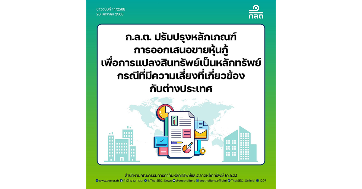 สำนักงานคณะกรรมการกำกับหลักทรัพย์และตลาดหลักทรัพย์ (ก.ล.ต.) ปรับปรุงหลักเกณฑ์การออกเสนอขายหุ้นกู้เพื่อการแปลงสินทรัพย์เป็นหลักทรัพย์ กรณีที่มีความเสี่ยงที่เกี่ยวข้องกับต่างประเทศ ได้แก่ กรณีที่สินทรัพย์ซึ่งจะโอนมายังนิติบุคคลเฉพาะกิจเป็นสิทธิเรียกร้องที่เกิดขึ้นในต่างประเทศ และกรณีที่ผู้มีสิทธิเสนอโครงการเป็นกิจการต่างประเทศ เพื่อให้สอดคล้องกับหลักเกณฑ์การออกเสนอขายตราสารหนี้อื่นที่มีความเสี่ยงของต่างประเทศ โดยกำหนดให้การออกเสนอขายต้อง (1) ได้รับการจัดอันดับความน่าเชื่อถือของตราสารไม่ต่ำกว่าระดับที่สามารถลงทุนได้ โดยสถาบันจัดอันดับความน่าเชื่อถือที่จัดตั้งขึ้นตามกฎหมายต่างประเทศ เว้นแต่เป็นการเสนอขายในลักษณะ PP10 (2) มีผู้แทนผู้ถือหุ้นกู้ และ (3) นำตราสารหนี้ที่เสนอขายไปขึ้นทะเบียนกับสมาคมตลาดตราสารหนี้ไทย