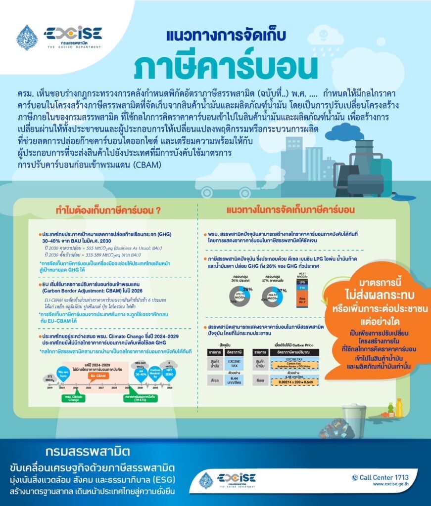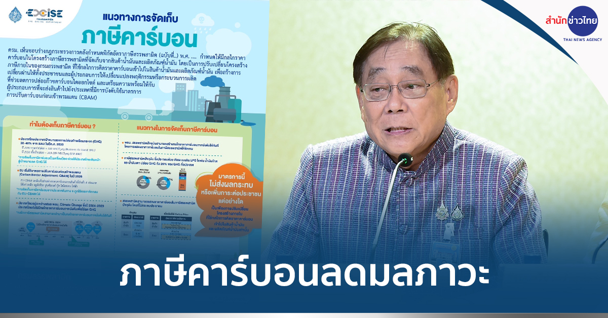ดร.กุลยา ตันติเตมิท อธิบดีกรมสรรพสามิต เปิดเผยว่า การกำหนดพิกัดอัตราภาษีสรรพสามิตขึ้นใหม่ เป็นเพียงการปรับเปลี่ยนโครงสร้างภายในของพิกัดอัตราภาษีสรรพสามิต เพื่อสร้างการเปลี่ยนผ่านให้ทั้งประชาชนและผู้ประกอบการให้เปลี่ยนแปลงพฤติกรรมหรือกระบวนการผลิตที่ช่วยลดการปล่อยก๊าซคาร์บอนไดออกไซด์ และเตรียมความพร้อมและการสร้างมาตรฐานสากล เมื่อส่งสินค้าไปยังประเทศบังคับใช้มาตรการการปรับคาร์บอนก่อนเข้าพรมแดน (Carbon Border Adjustment Mechanism: CBAM) ในหลาย ๆ ประเทศ จึงเตรียมตัวเพื่อใช้ราคาคาร์บอนที่มีการจัดเก็บมูลค่าส่วนต่างราคาคาร์บอนจากสินค้าที่จะนำเข้าไปในประเทศนั้น ๆ ยืนยันว่าการกำหนดราคาคาร์บอนนี้จะไม่ส่งผลกระทบต่อต้นทุนของภาคอุตสาหกรรมและค่าครองชีพของประชาชน.-515- สำนักข่าวไทย