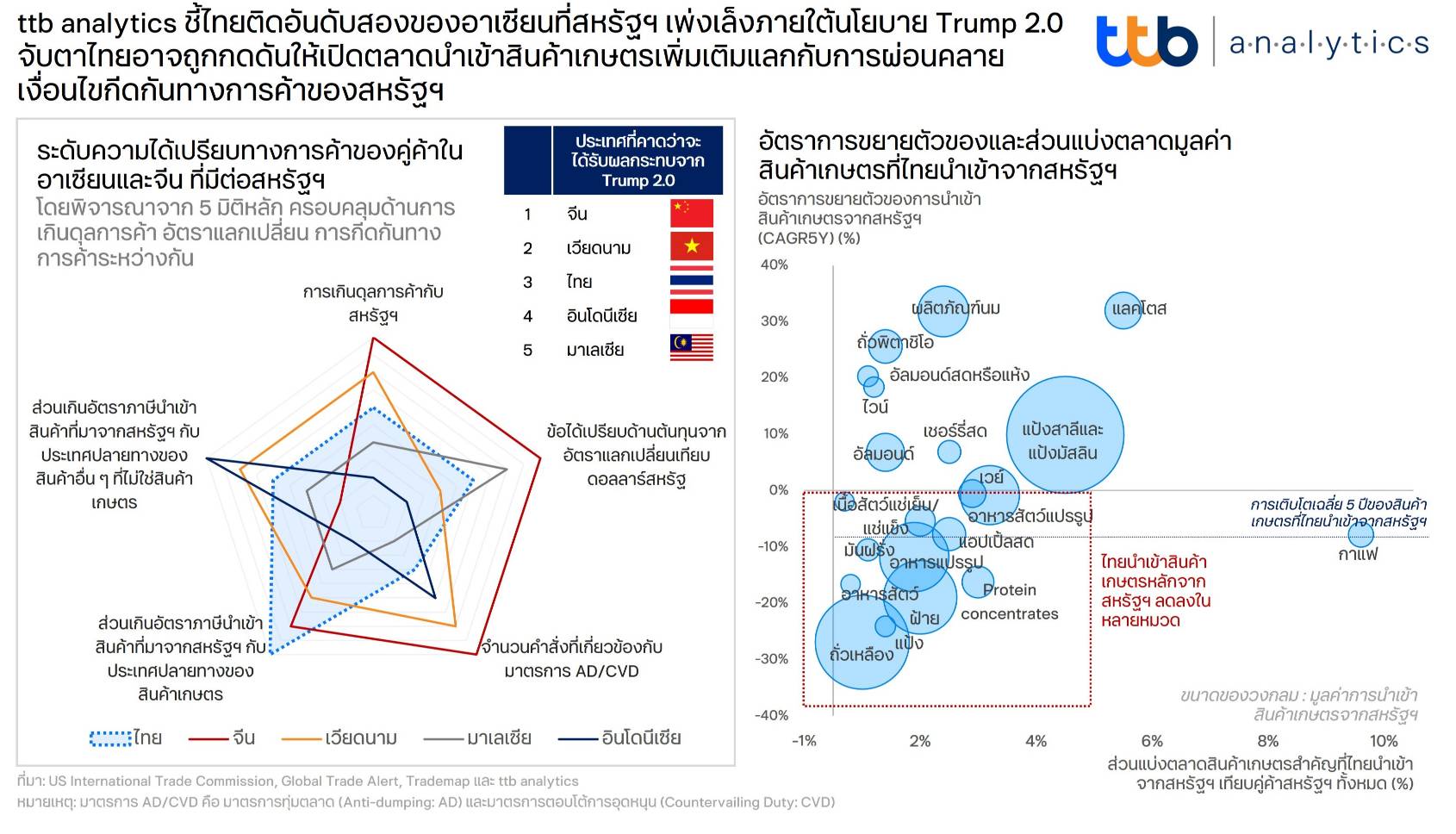 ศูนย์วิเคราะห์เศรษฐกิจ ทีทีบี หรือ ttb analytics ประเมินว่า ไทยมีความเสี่ยงจะถูกเพ่งเล็งจากมาตรการกีดกันทางการค้าของสหรัฐฯ ภายใต้นโยบาย Trump 2.0 สูงเป็นอันดับที่ 2 ของอาเซียน จากการที่สหรัฐฯ เสียเปรียบทางการค้ากับไทยในหลายมิติ ไม่ว่าจะเป็นการเกินดุลการค้าของไทยสูง ข้อได้เปรียบด้านต้นทุนจากการอ่อนค่าของค่าเงินบาท จำนวนคำสั่งมาตรการ AD และ CVD ในหลายประเภทสินค้าสูงกว่าคู่เทียบ โดยเฉพาะการจัดเก็บภาษีนำเข้าสินค้าเกษตรของไทยในอัตราที่ค่อนข้างสูงเมื่อเทียบกับคู่ค้ารายอื่น ซึ่งอาจทำให้สหรัฐฯ นำมาเป็นข้อต่อรองในการพิจารณาขึ้นกำแพงภาษีนำเข้าระลอกใหม่ ส่งผลให้ไทยมีความเสี่ยงที่จะถูกกดดันให้เปิดตลาดนำเข้าสินค้าเกษตรที่สำคัญเพิ่มเติม อาทิ เนื้อสัตว์และเครื่องในสัตว์ ถั่วเหลือง และข้าวโพดเลี้ยงสัตว์