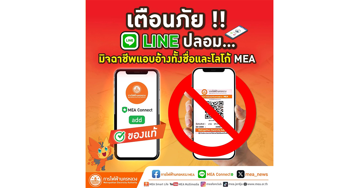 กรุงเทพฯ 24 ม.ค.-นายคมกริช สาคริก ผู้อำนวยการฝ่ายสื่อสารองค์กร MEA หรือการไฟฟ้านครหลวง เตือนภัย ระวัง มิจฉาชีพ อ้างชื่อ-โลโก้ MEA