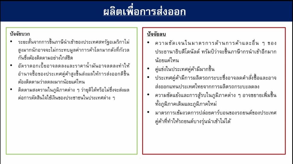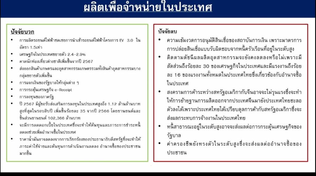 ส่วนปัจจัยลบ สภาอุตสหากรรมฯ เป็นห่วง ความเข้มงวดของสถาบันการเงินปล่อยกู้การซื้อรถ ทำให้ยอดปฏิเสธสูงกว่าร้อยละ 70 จึงกระทบต่อยอดขาย เนื่องจากคุมเข้มปัญหาหนี้ครัวเรือน หลังแบงก์ชาติ กำชับต้องปล่อยสินเชื่ออย่างรับผิดชอบ มาตรการเข้มงวดในการปล่อยก๊าซคาร์บอนของประเทศคู่ค้า บางรุ่นอาจส่งออกไปไม่ได้ รวมถึงมาตรการนำเข้าสินค้าจากสหรัฐ อาจกระทบถึงไทย จึงต้องจับตาอย่างใกล้ชิด. -515- สำนักข่าวไทย