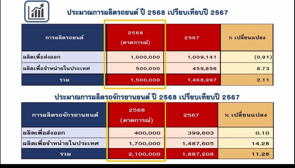 นายสุรพงษ์ ไพสิฐพัฒนพงษ์ รองประธาน และโฆษกกลุ่มอุตสาหกรรมยานยนต์ สภาอุตสาหกรรมแห่งประเทศไทย (ส.อ.ท.) เปิดเผยว่า ยอดผลิตรถยนต์เพื่อจำหน่ายในประเทศในปี 2567 จำนวน 459,856 คัน ผลิตเพื่อส่งออก 1,009,141 คัน ขณะที่ในปี 68 ตั้งเป้าหมาย ยอดผลิตรถยนต์เพื่อจำหน่ายในประเทศ 1 ล้านคัน จึงเพิ่มขึ้นเพียงเล็กน้อย การผลิตรถยนต์ยังเกิน 1 ล้านคัน ถือว่ายังไม่เป็นปัญหาวิกฤติสำหรับกลุ่มยานยนต์